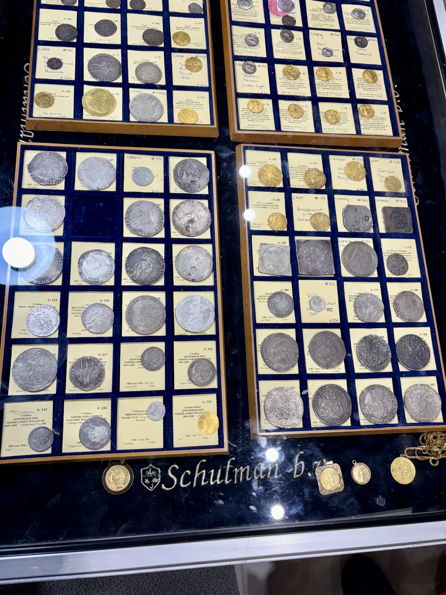 Saturday, January 11, 2025. We have breakfasted but not left the hotel yet. The bourse doesn’t open to the public until 10:00 AM, so there’s some time to kill. I’m going through some of yesterday’s pictures. There are two things I’m sort of looking for while at the show. The first is a US $3 gold piece, to replace the one I now regret selling last year. Either of these two I saw at one table would be an upgrade to the XF40 I had, but I’m not really sure if I’d take the plunge on either of them. They’re on my “thinkin’ about” list. Update: I bought neither one, but found a different AU58 on Sunday. The second thing I’m sort of looking for is a gold Spanish cob, preferably with a shipwreck pedigree. This one I saw (at the same table as those $3 pieces) does fit the criteria, but I think the pricetag ($7,500, as I recall) is way, way beyond my pain threshold. So this one is not likely to happen. (Terrible pix- sorry- didn’t even get the full slab in the frame.) I sorta had this notion in my head (perhaps misguided) that I could maybe find a small gold cob in the $2-3K range, if I looked hard enough. Am I way out of touch with reality there? I would like to visit the Sedgwick table, if they’re at the show. I’m confident they are. Update: I failed to make it to the Sedgwick table, but I did find my gold cob on Saturday.
