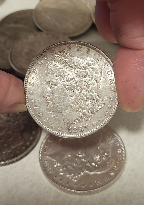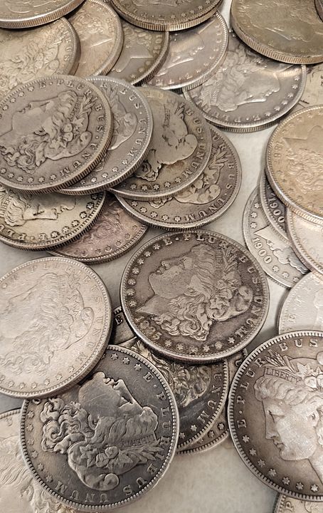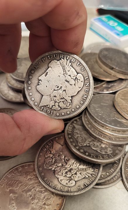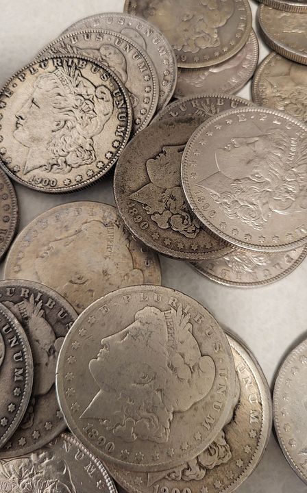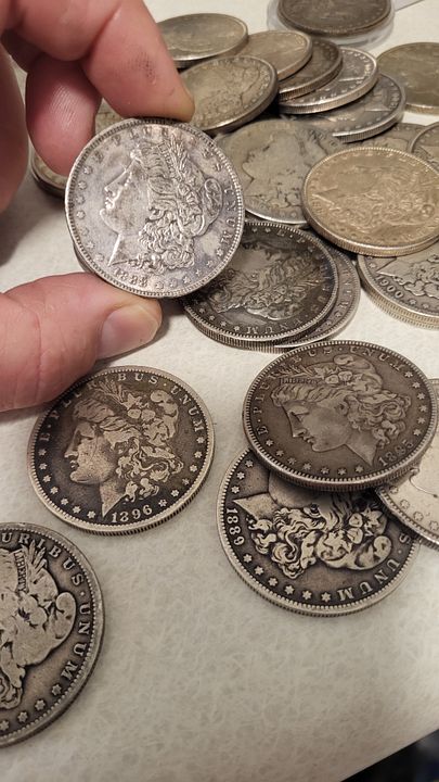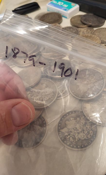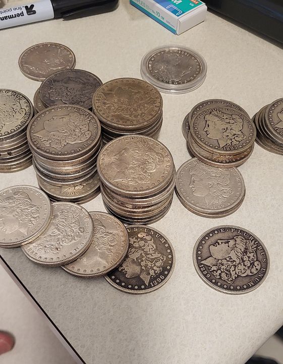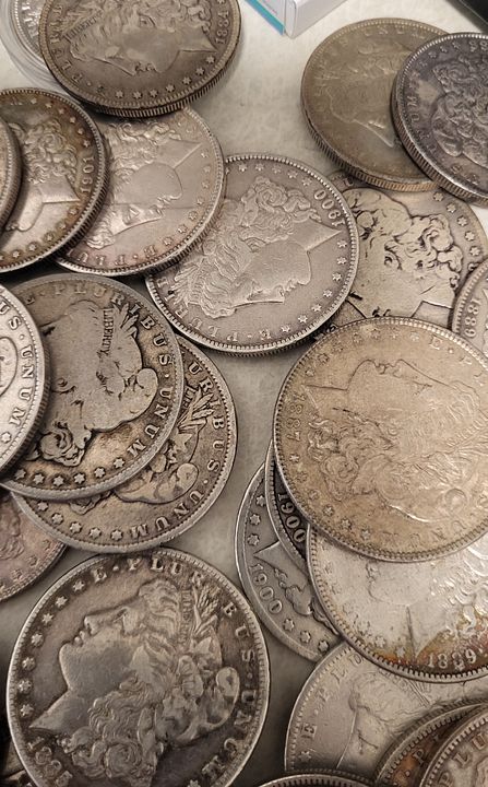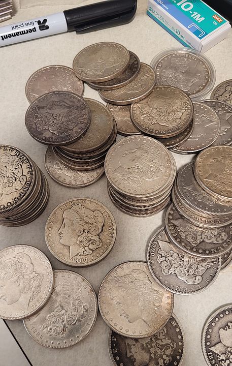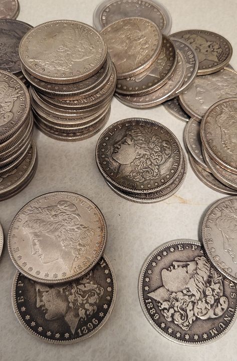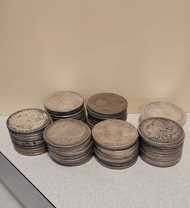 65 Morgan Dollars older dates but common and duplicates, various mints. See pictures. Many nice coins and toners. No 1921 in here. $2400 delivered