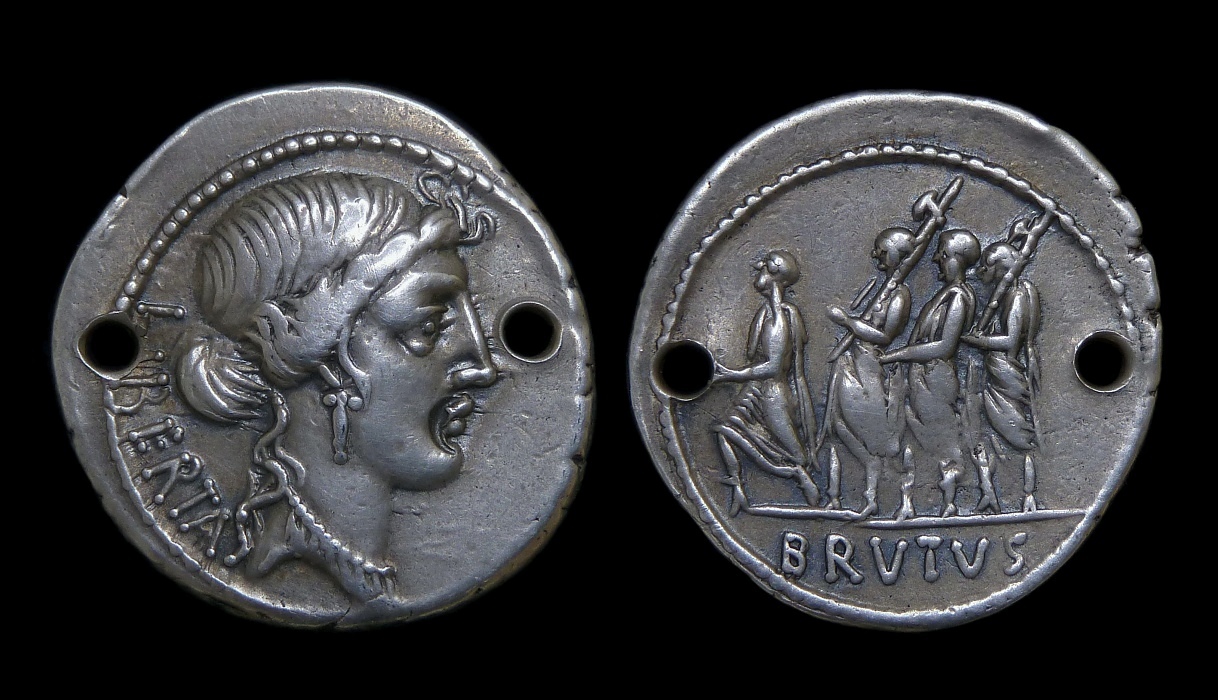 One of my favorite coins purchased last year... ROMAN REPUBLIC AR Denarius. Holed. 3.58g, 20.8mm. Rome mint, 54 BC. M. Junius Brutus, moneyer. Crawford 433/1; Sydenham 906. O: Head of Libertas right; LIBERTAS behind. R: The consul L. Junius Brutus walking left between two lictors, each carrying fasces over shoulder, preceded by an accensus; BRVTVS in exergue. Ex Michael Kelly Collection And one of my favorites so far this year... TIBERIUS AR Denarius. Holed and gilded in antiquity. 3.67g, 21mm. Lugdunum mint, Group 4, AD 18-35. RIC I 30; Lyon 150; RSC 16a. O: TI CAESAR DIVI AVG F AVGVSTVS, laureate head right; one ribbon on shoulder. R: PONTIF MAXIM, Livia, as Pax, seated right, holding scepter and olive branch, feet on footstool; ornate chair legs, single line below.
