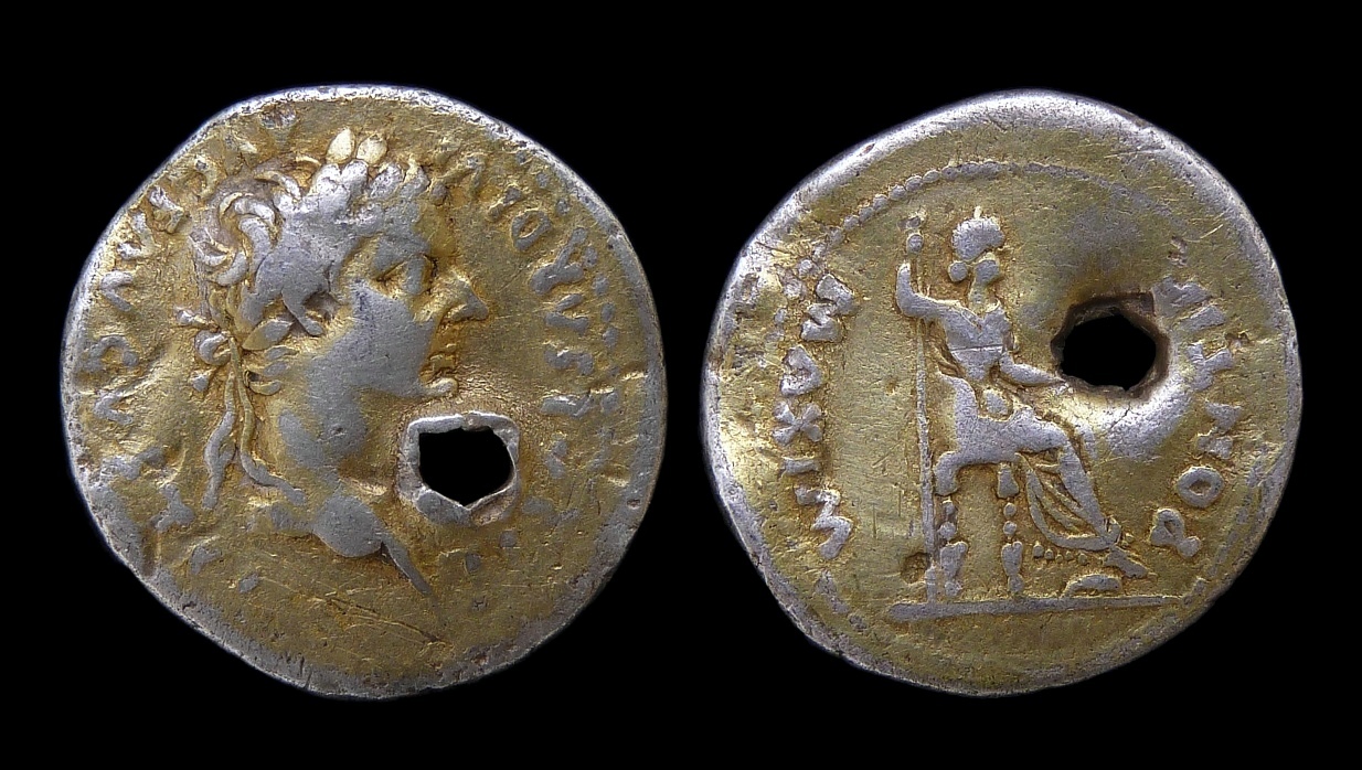 The only holed coin that I have is this Republican denarius of C. M. Thermus. If you look closely at the area around the hole on the obverse, you'll see what I believe is a remnant of a base metal attachment, indicating that side was displayed. I like to image that since it depicts Mars it was a Roman soldier's charm. Q. Minucius Thermus Obverse: Head of Mars left, wearing crested helmet, ornamented with plume and annulet Rev: Two warriors fighting; the left protects fallen comrade, the other wears a horned helmet; Q • THERM M F in exergue Minted at Rome in 103 BC, Crawford 319/1