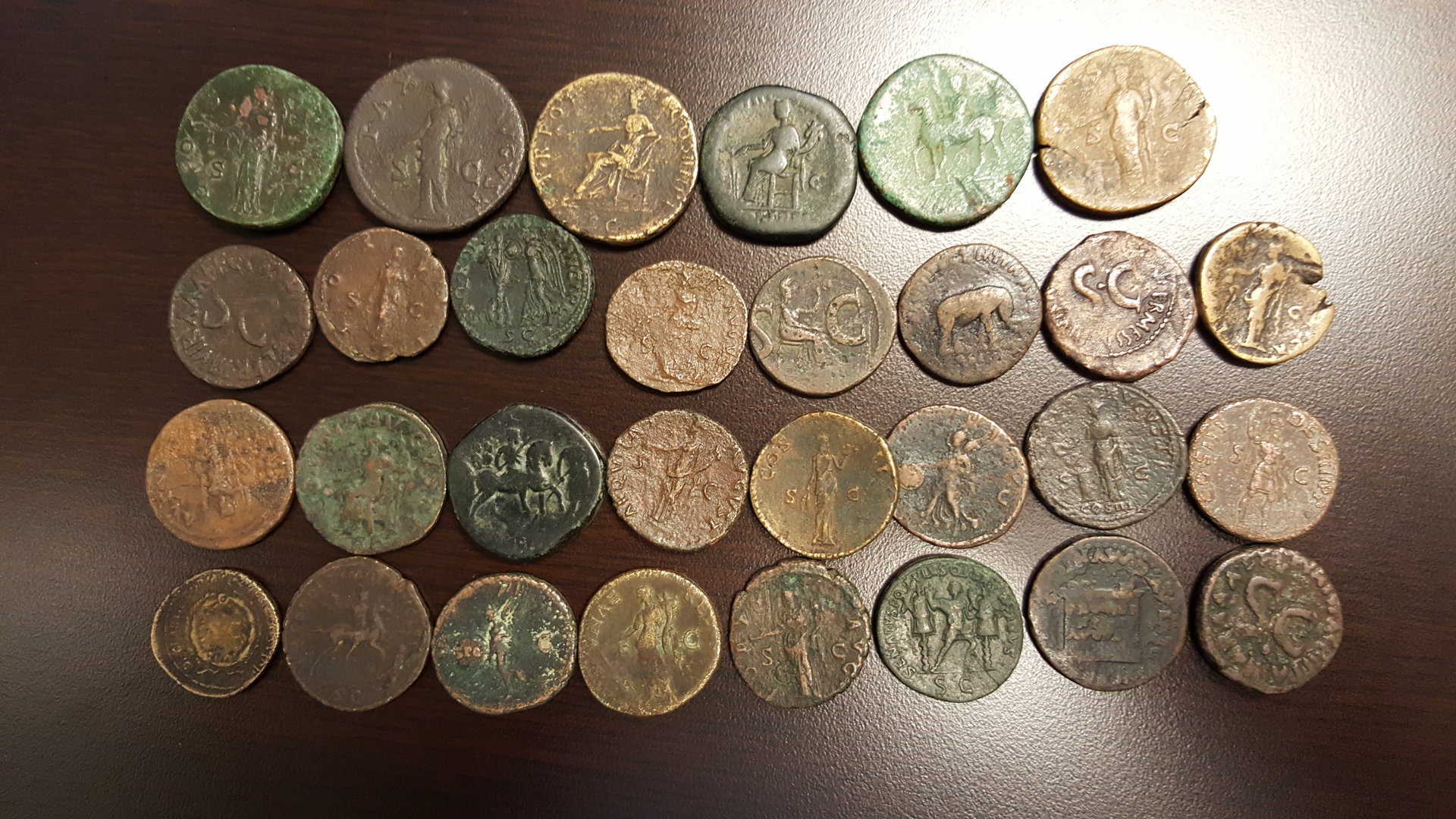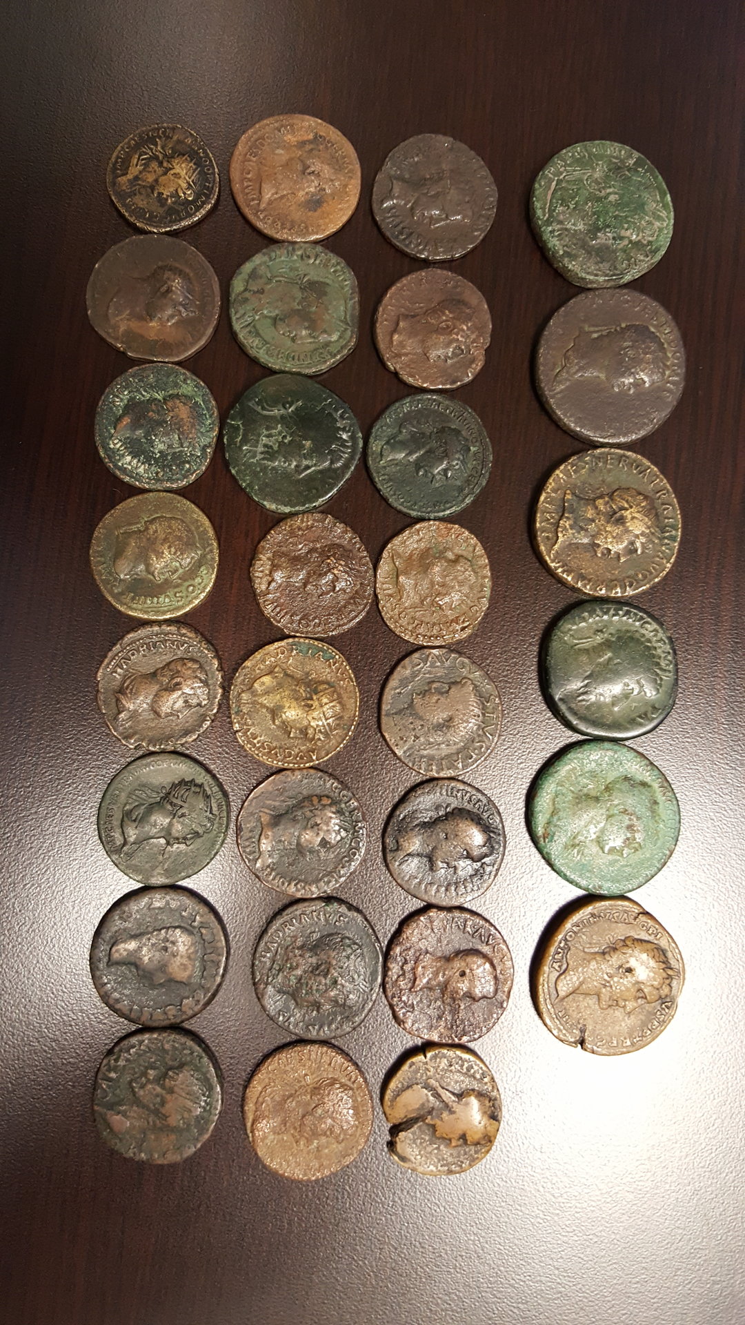 Hey I'm a MS Paint editor too! (None of the below photos were taken or edited by me) I see one in your group like mine: Antoninus Pius, AD 138-161 AE, As, 27mm, 9.3g; 2h; Rome, AD 148-149 Obv.: ANTONINVS AVG PIVS P P TR P XII; Laureate head right, aegis on left shoulder Rev.: MVNIFICENTIA AVG; elephant walking right with trunk raised In Ex.: COS IIII SC Now for my biggest Romans: Maximinus Thrax, Rome, AD 235-238 AE, sestertius, 31mm, 20g; 12h; AD 235-236 Obv.: IMP MAXIMINVS PIVS AVG; laureate, draped bust right Rev.: PROVIDENTIA AVG; Providence standing left with cornucopiae and wand over globe at feet, S-C across field Gordian III, AD 238-244 AE, sestertius, 25.46g, 32.5mm; 12h; Rome, AD 238-239 Obv.: IMP CAES MANT GORDIANVS AVG; laureate, draped, and cuirassed bust right Rev.: VICTORIA AVG; Victory advancing left, carrying wreath and palm; S-C
