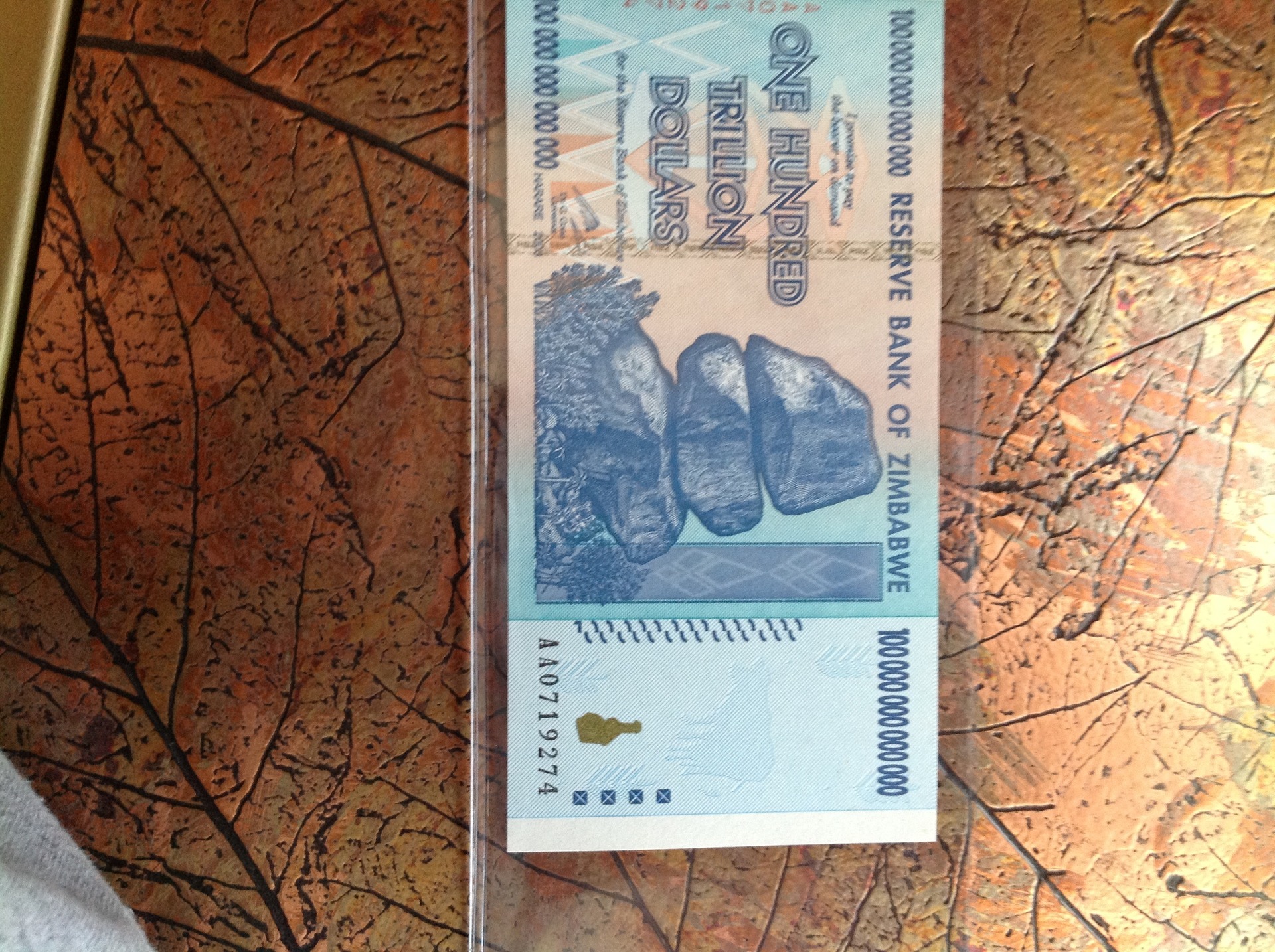 I picked one of these up on Ebay several months ago. From what I have read about the Zimbabwe hyperinflation, prices were doubling about every 24 hours, and public transportation was more expensive during the evening commute than in the morning. It's pretty sad when a country has to give up on issuing its own currency. I also have some Turkish lira notes denominated in millions that I kept from our honeymoon several years ago. I remember changing a 10 dollar bill at the airport and getting 14 million lira. That seemed like a lot, but 100 trillion is just ridiculous...