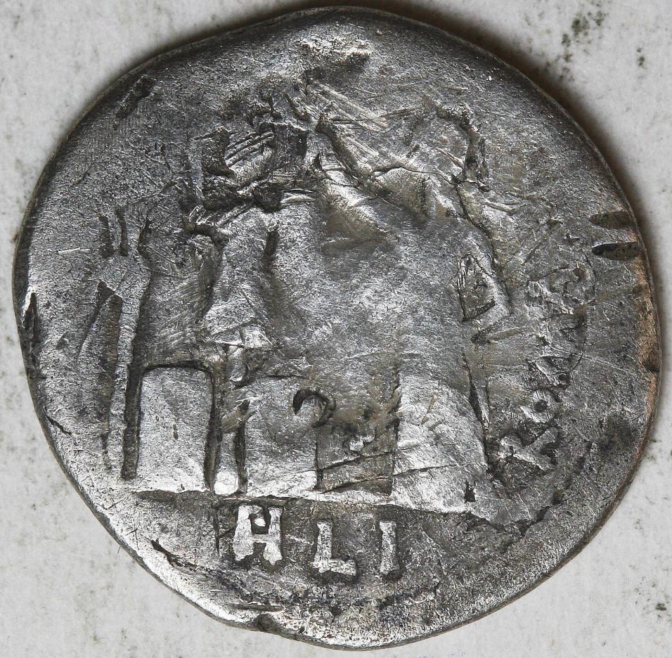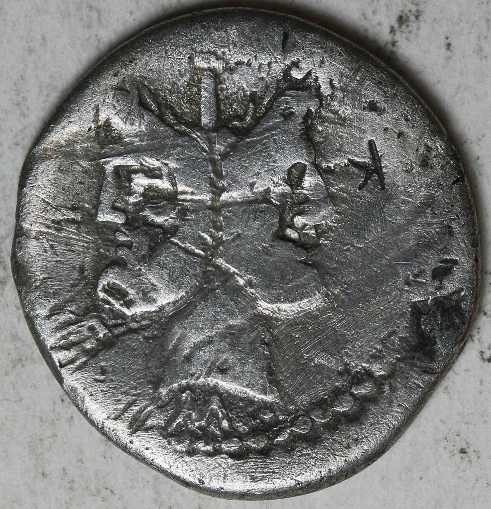 This is the closest attribution I could come up for this one. M Furius Lf Philus Denarius. 119 BC. Laureate head of Janus; M•FOVRI•L•F around / Roma standing left erecting trophy, gallic arms around, ROMA to right, PHLI in ex. Thoughts?