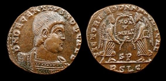 Born in Samarobriva (Amiens), Gaul, Magnentius was the commander of the Herculians and Jovians, the Imperial guard units. When the army grew dissatisfied with the behavior of Roman EmperorConstans, it elevated Magnentius at Autun on January 18, 350. Constans was abandoned by all except a handful of retainers, and he was slain shortly afterwards by a troop of light cavalry near the Pyrenees.