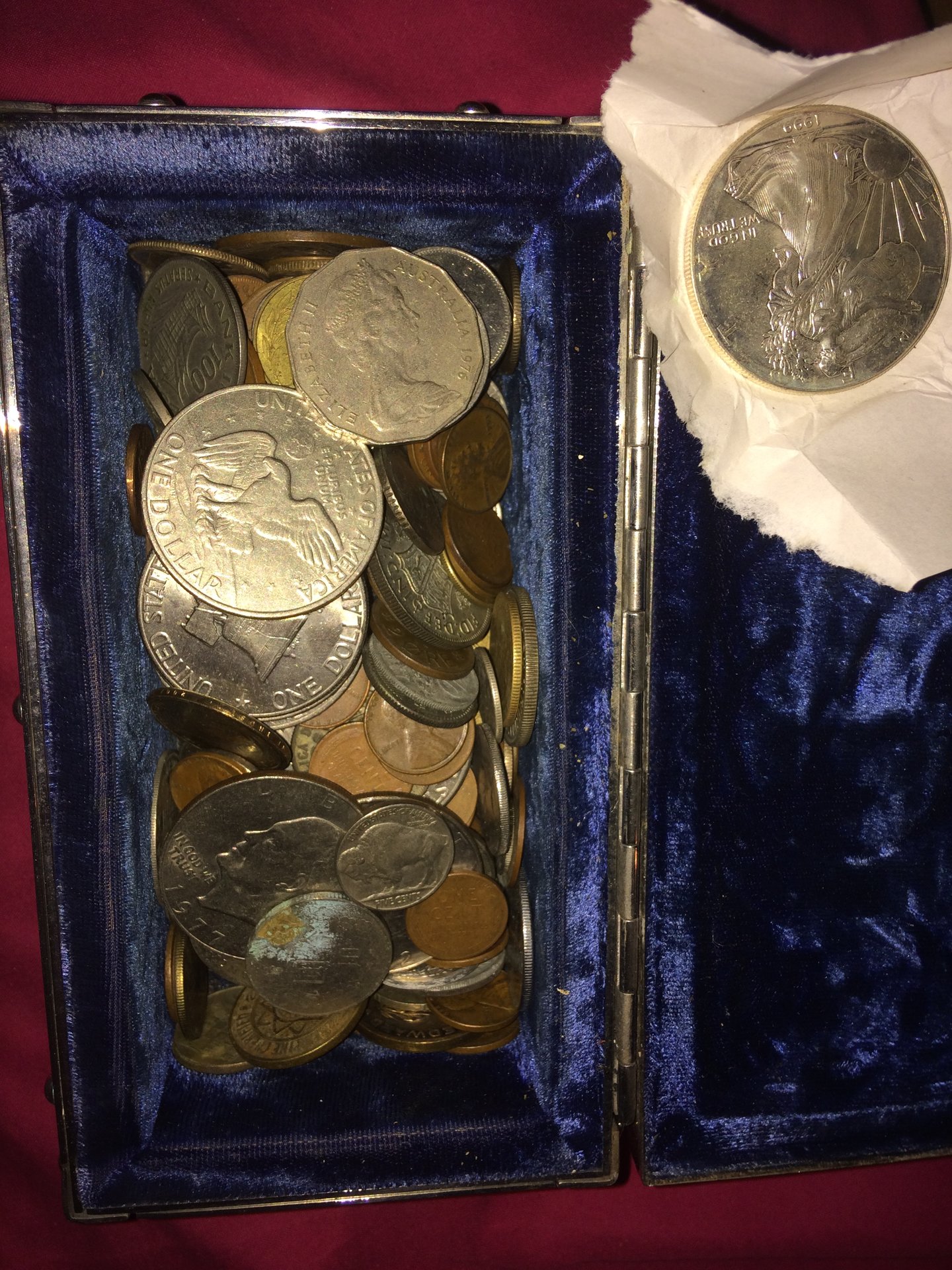 Hi, Thank you all so much for the ideas and research. Not snapping a photo of the back was a true rookie move (doh!) Here it is, along with box and the rest of the coins. The one sitting up top is one of the few I’ve added to the collection. (Not foreign, so apologies if site rules are strict on such matters) I was a food server for many years and received it after a customer asked if I’d seen one before — I believe the coins must have just come out, so it would have been 1999. I’ve always kept it wrapped up in that paper as I had a cursory knowledge about the edges needing to be unmarred (question: does that matter?) There are a few buffalo nickels in the box and these have always appealed to me so much, as do wheat penny. A question occurred to me after I posted last night. As coin aficionados and appreciators, is it considered a mortal sin to turn coins into rings? I’ve always fancied the look, and wondered if it is an egregious offense. (Not to get political or attempt to stir anything up ...) Mahalo much again.