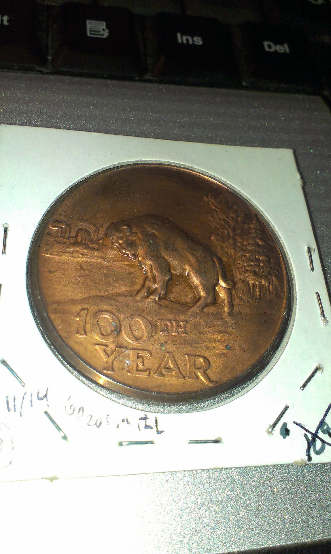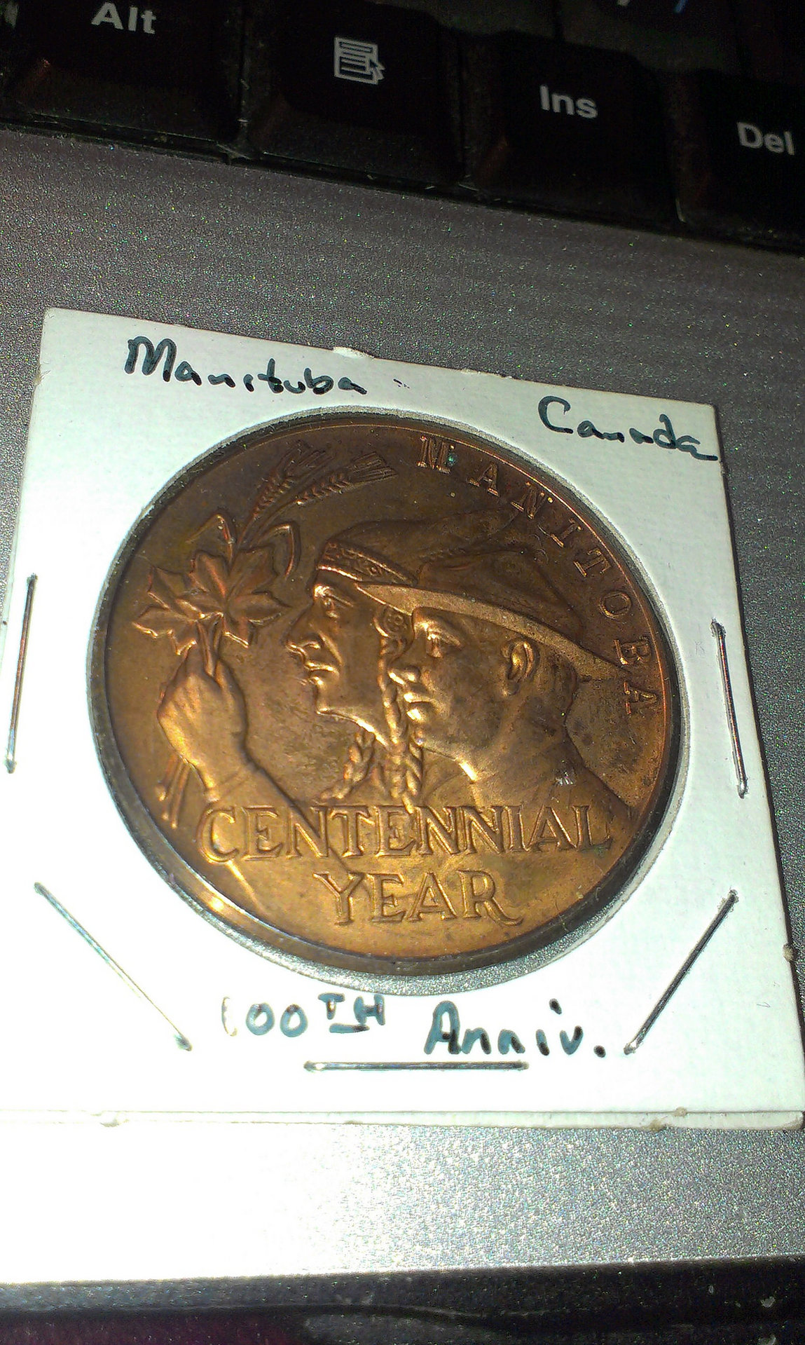 About the size of a US Half Dollar, with a dual profile obverse (showing a Native American & a Mountie, holding a pair of Maple leaves and 2 stalks of wheat) with the legend "Manitoba - Centennial Year". The reverse shows a high relief buffalo with smoke towers to one side and forest to the other, standing on the legend "100th Year". Any idea what this is worth or who the issuer is?