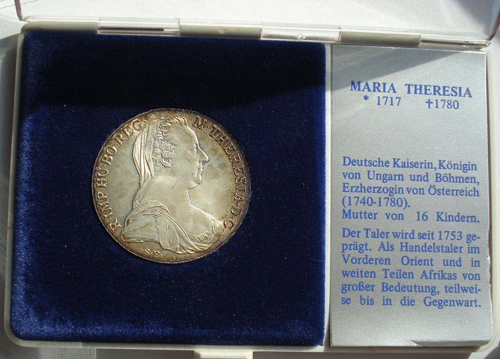 I have what I think is a unique Maria Theresa Thaler in a plastic case. I purchased it several years ago and I have yet to see another in this type of presentation I am hoping someone else has one like this or can shed some light on it's origin. I was given this translation: German empress, queen of Hungary and Bohemia, Archduchess of Austria 1740-1780. Mother of 16 children. The Taler has been minted since 1753. Had major significance as a trade taler in the Vorderer Orient (ie. roughly the Middle East) and many parts of Africa, partly until today. I realize this is a restrike and my research indicates it was struck in Prussia possibly prior to 1930. I suspect it to be a Hapner 49 but not sure. Comment welcome, thanks