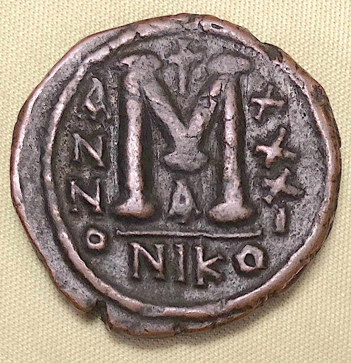 Just happen to have this Justinianus, not a masterpiece: AE Follis, 31 x 32 mm, 17.48 g Nicomedia, (regnal year 31 =) 557 – 558 AD, 1st officina (Letter A) Reference: DO 137a; MIBE 113a; Sear 201 Obverse: D N IVSTINI – ANVS P F AVG Helmeted, diademed and cuirassed bust facing, holding globus cruciger and shield decorated with horseman and enemy motif; in r. field, cross Reverse: Large M between A / N / N / O – X / X / X / I; above, cross and beneath, A. In exergue, NIKO The large M on the reverse is the denomination (40 nummi = 1 Follis), NIKO refers to the mint, and ANNO XXXI the year it was struck.