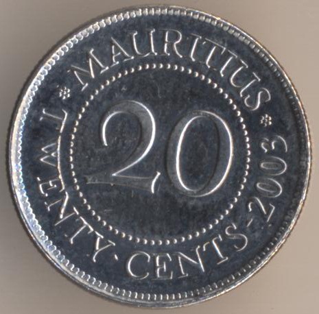 Republic of Mauritius (since March 12 1992). 20 cents 2003, nickel plated steel, weight - 3 g., size - `9 mm, thickness - 1,65 mm, mintage - unknown. Coins of this type were released at 1987, 1990-91, 1993-96, 1999, 2001, 2003-2005, 2007, 2010 and 2012.