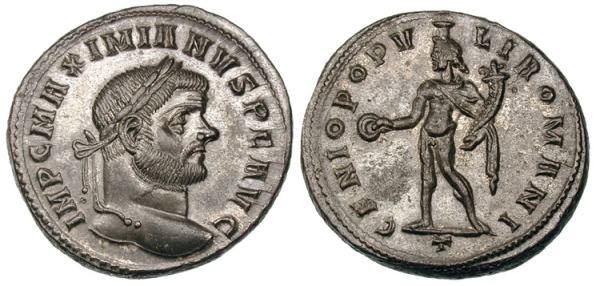Caution should be exercised when attributing folles of Galerius Maximian (Caius Galerius Valerius Maximianus) & Maximian Herculius (Marcus Aurelius Valerius Maximianus) due to the similarity of their titulature. Galerius Maximian was both Caesar and Augustus during this time period whereas Maximian Herculius was always only Augustus. Therefor coins bearing the titulature MAXIMIANVS plus NOBIL CAES, NOB CAES, NOBIL C, etc., can only be those of Galerius Maximian. There is a special problem with Galerius as Augustus coins: The titulature is mostly exactly the same as that of Maximian Herculius and frequently the only way to differentiate between the two is by the portraiture on the coin obverse.