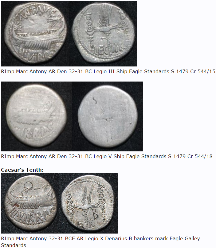 Mr @Mat: GREAT Saturnalia Coins! Man, the SaturSanta was great for you! I have a Potin Tet from Alexandria, but it is of Carinus: POTIN TET: RI Carinus 282-285 CE Potin Tet Alexandria Egypt 19mm Athena Seated holding Nike MARCUS ANTONY LEGIO DENARII: RImp Marc Antony AR Den 32-31 BC Leg V Ship Eagle Standards S 1479 Cr 544/18 From WIKIPEDIA: Legio V Alaudae (Larks): 52 BC–86 (destroyed by the Dacians in the first Battle of Tapae), Julius Caesar (emblem: elephant) founded RImp Marc Antony AR Den 32-31 BC Leg III Ship Eagle Standards S 1479 Cr 544/15 From WIKIPEDIA: Legio III Cyrenaica (from Cyrenaica): probably around 36 BC to (at least) 5th century, Mark Antony founded RImp Marc Antony 32-31 BCE AR Legio X Denarius B bankers mark Eagle Galley Standard From WIKIPEDIA: Legio X Fretensis (of the sea strait), also known as X Equestris (Mounted): before 58 BC–45 BC, Julius Caesar's personal legion.
