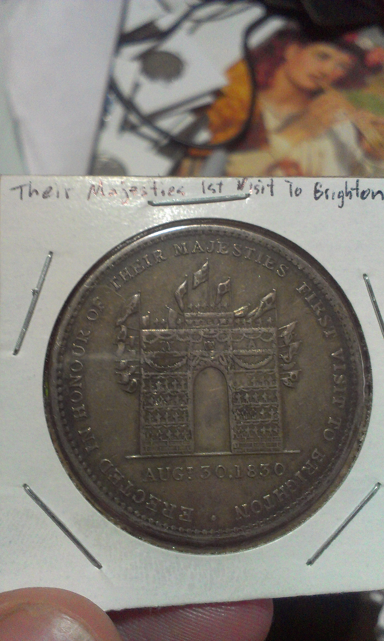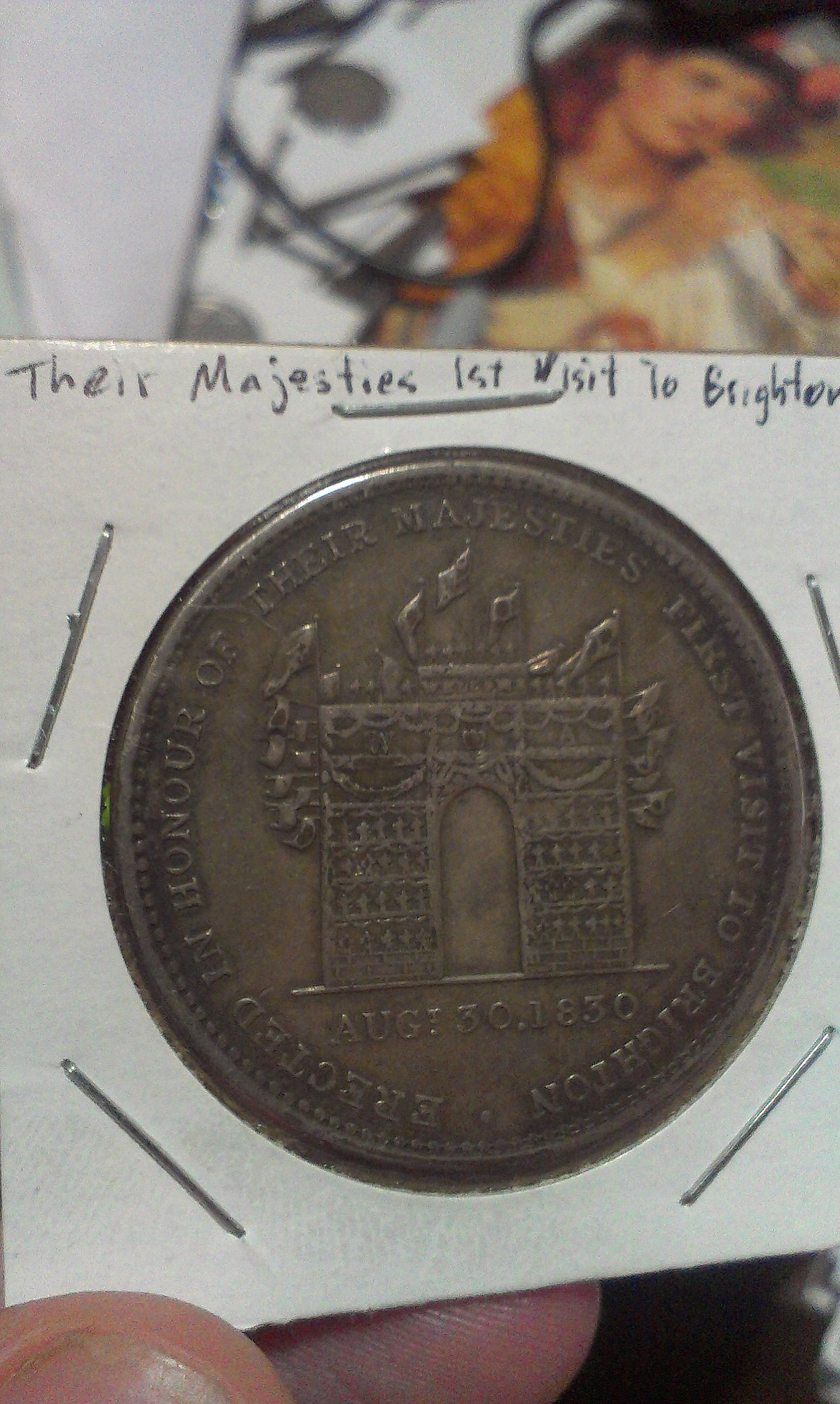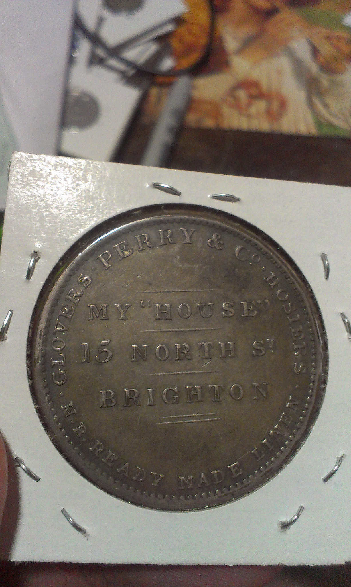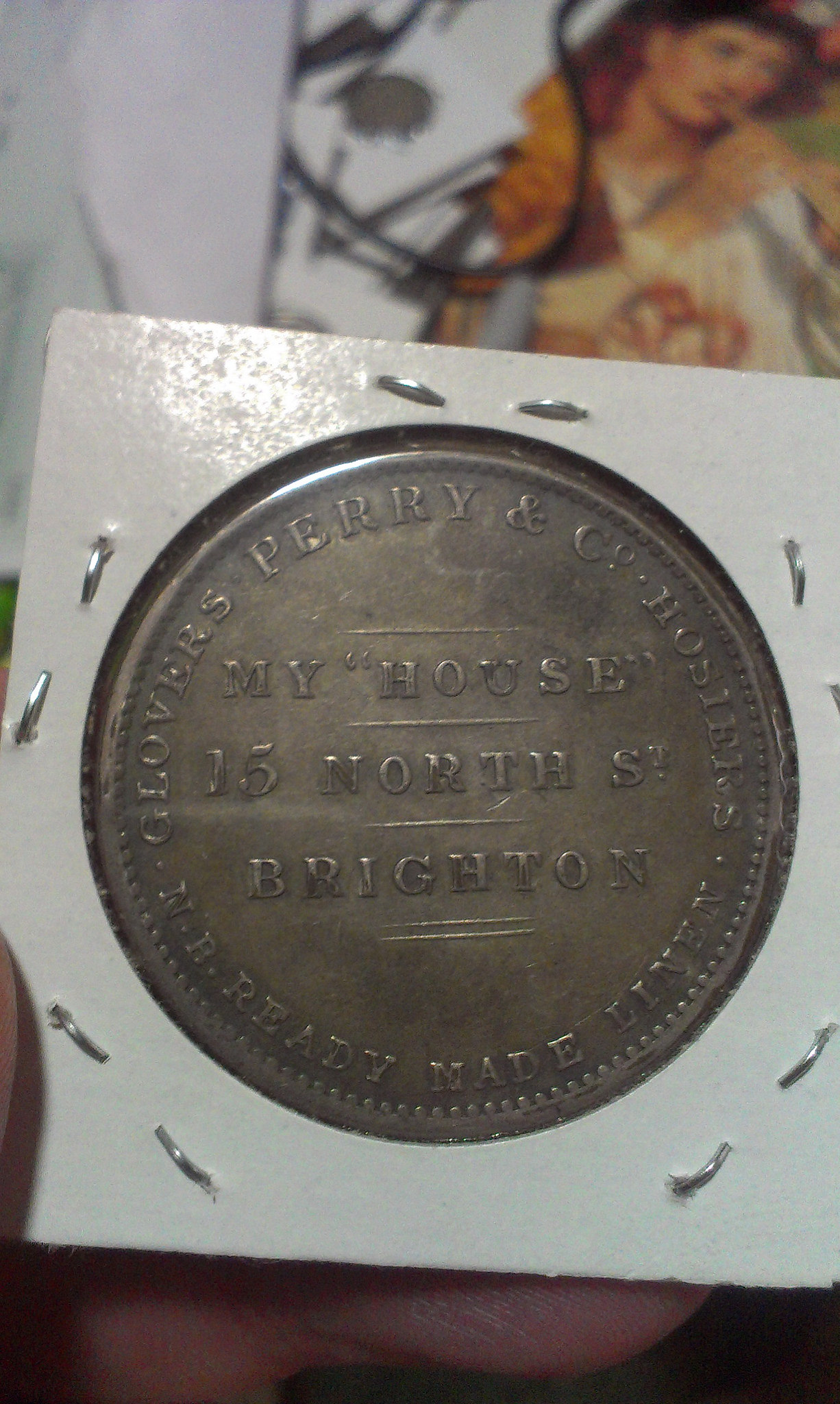 38mm in diameter, the obverse legend is "Erected in honour of their majesties first visit to Brighton" with a flag draped arch. The reverse reads "Glovers * Perry & Co * Hosiers * N. B. Ready Made Linen *" around "My "House" / 15 North St / Brighton".