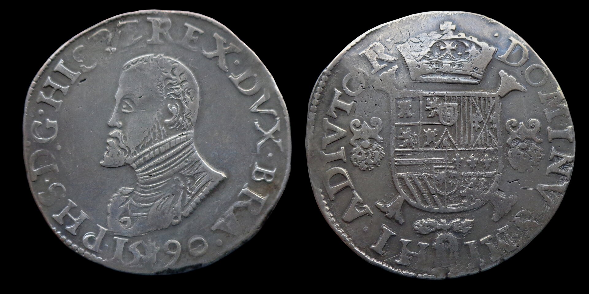 Nice coin! Philip II reign is very interesting, a lot of things happened in the low countries under his rule. It allows me to share one of the coins I cherish the most in my collection. Philip II, Brabant - Filipsdaalder (Antwerpen, 1590) Obv. : PHS D G HISP Z REX DVX BRA Rev. : DOMINVS MIHI ADIVTOR (Le Seigneur est mon aide) 34,05g / 43mm Mintage : 667.323 One of the coins I wanted since I started to have interest in "older belgian coins". I could afford this one in october/november 2019. It's not going to leave my collection anytime soon. Maybe one day I will be able to get another coin of him I really want : an ecu or 1/2 "states" ecu. Notice the golden fleece on his chest (even though it almost looks like a maggot) and at the bottom of the coat of arms on the reverse. Also, when this one was issued he was also king of Portugal, so the small shield of Portugal appears on the reverse.
