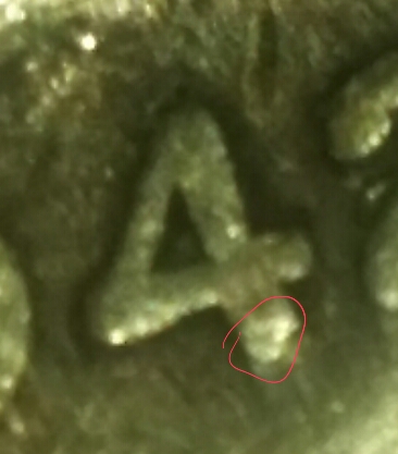 Just off hand I don't think it is. I would expect the bottom "nub" of the 1 under the base of the 2 to be stronger than that. I think what we are seeing there is flow lines from die wear. I don't believe the end of the crossbar of the 4 is right either. I think there should be a pronounced notching in the end of the cross bar from the doubled die.