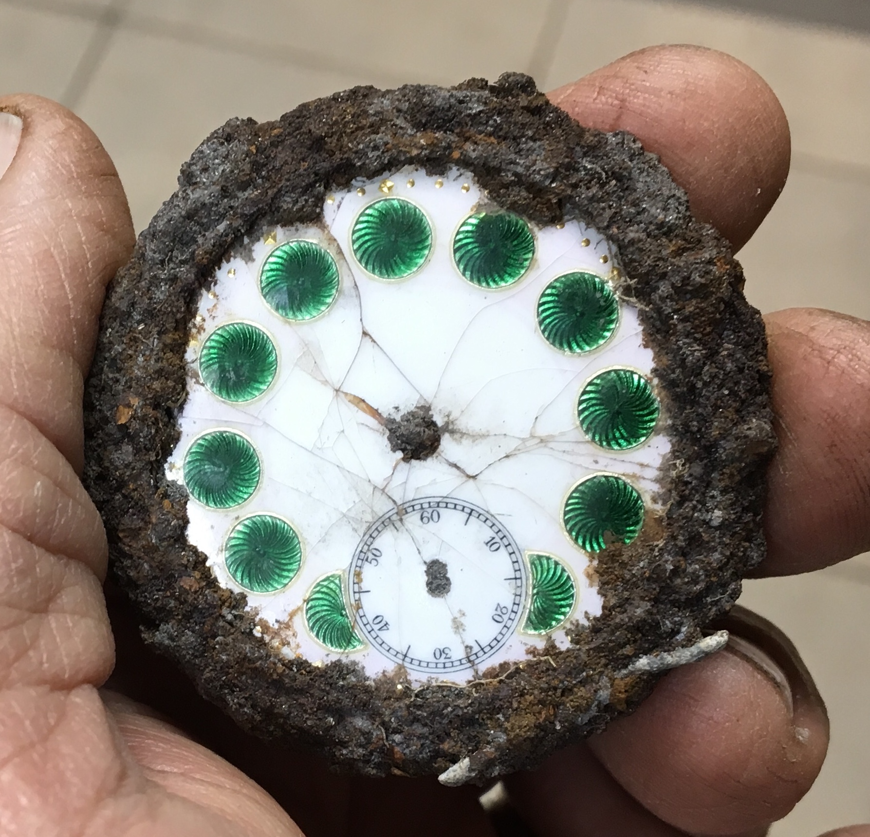 Here is an example of curb hunting finds. Those are emeralds for hour marks and each is outlined in gold and the minute marks are dots of gold.