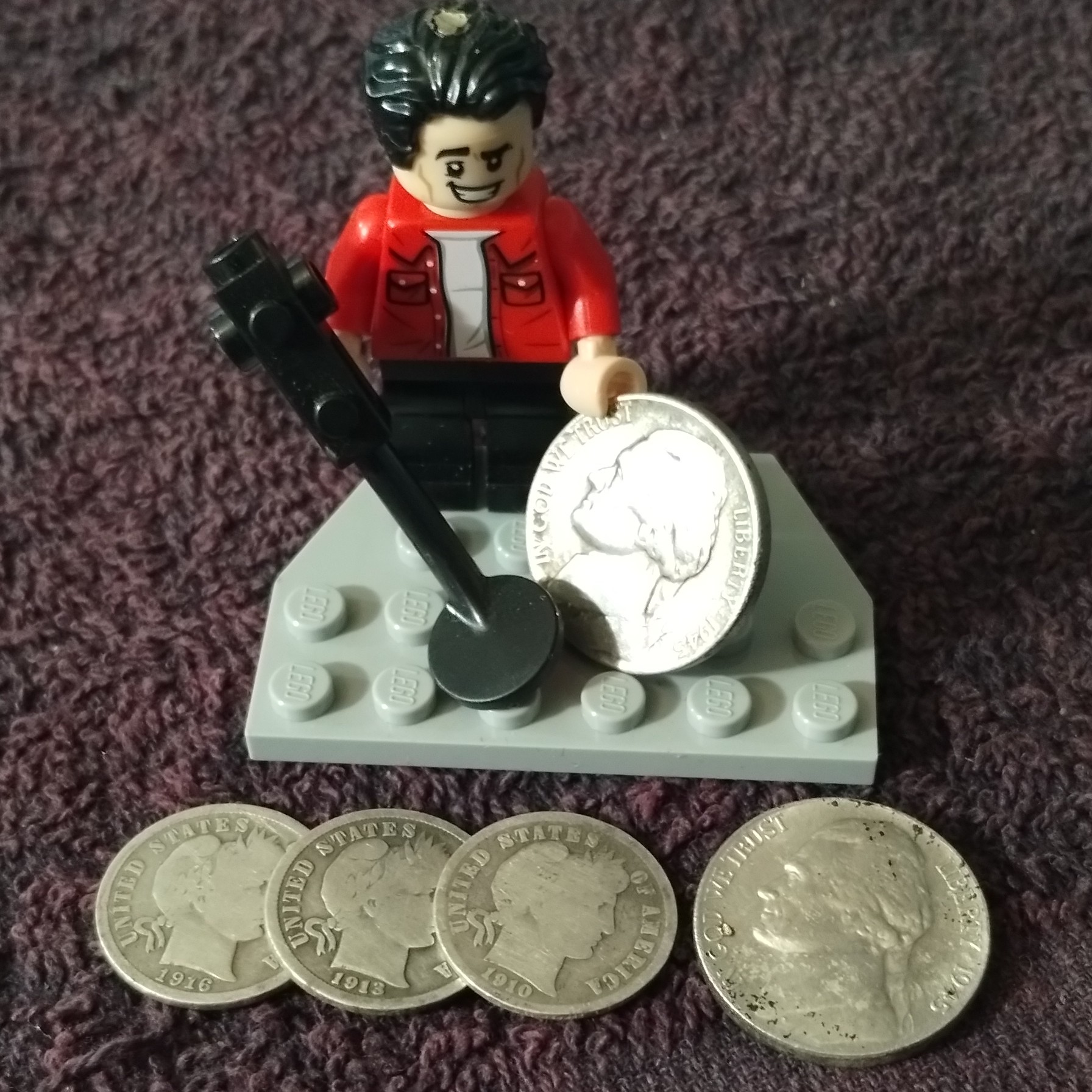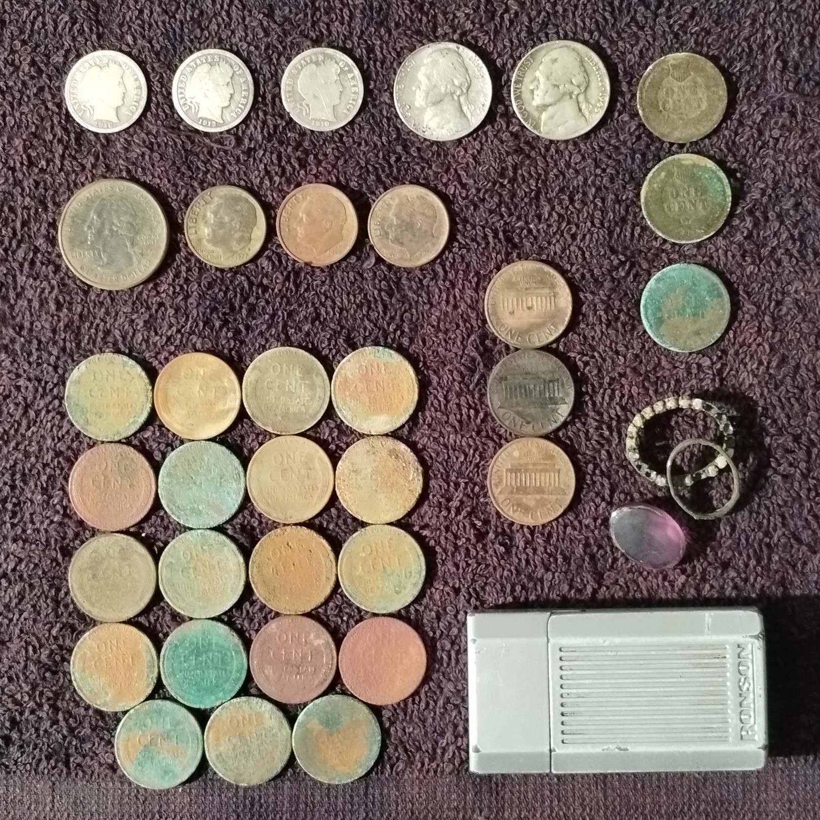 Hello everyone, Yesterday I did another dirt fishing trip to Pelham Bay Park in NYC. This time it was a solo trip since no one from our club or the other 3 guys I detected with last weekend could not come. I once again had success in finding 5 Silver US Coins! So now I have 10 US Silver Constitutional Silver Coins for 2026 3 Barber Dimes - 1910-D, 1913 & 1916 35% Silver Wartime Nickels - 1945-P & 1945-S 3 Indian Head Cents - 1890, 1891 & 1904 The area has some chemically treated dirt, so they come out looking pretty bad Same for the 19 Wheat Cents Old pendant - The Amethyst Crystal detached when I cleaned it Ronson Lighter - Modern Torch Style Everything Joey with the silver Picture taken at the park (Before Cleaning) These were the 5 Silver coins from my last trip