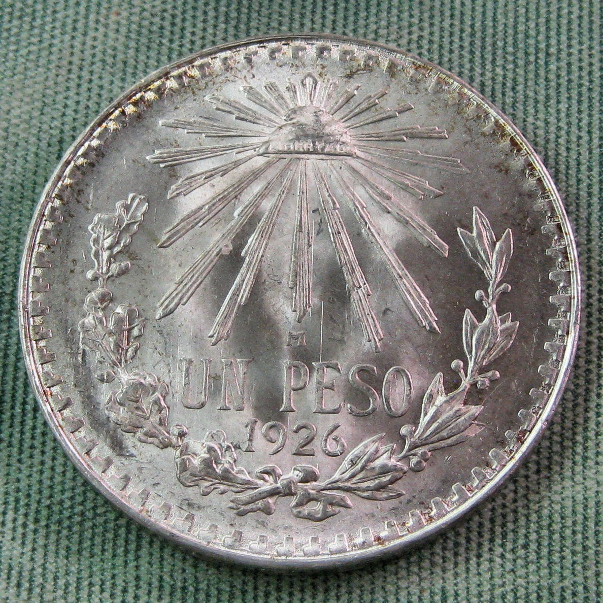 Here are 2 more Mexican coins: a really gem BU 1926 peso and a nice BU of the 1954 5 peso, the rarest date of the series. Only 30,000 were struck of the 1954 coin, as the price of silver went up that year making this size and weight of a 5 peso coin no longer practical for the mint. It only sells in the $75 to $100 range in this condition because most of the insiders knew it was going to be a low mintage and bought most of them in quantity