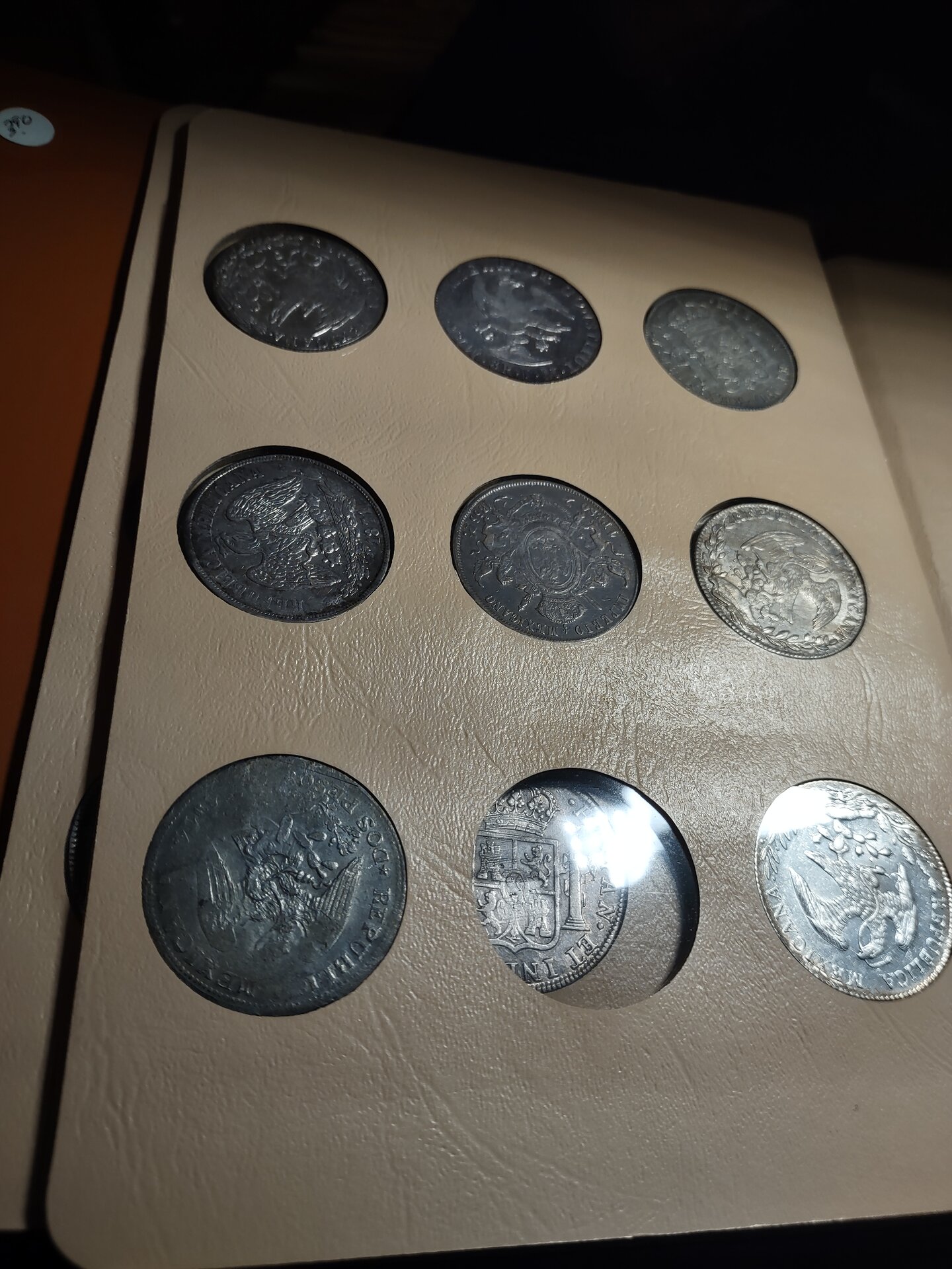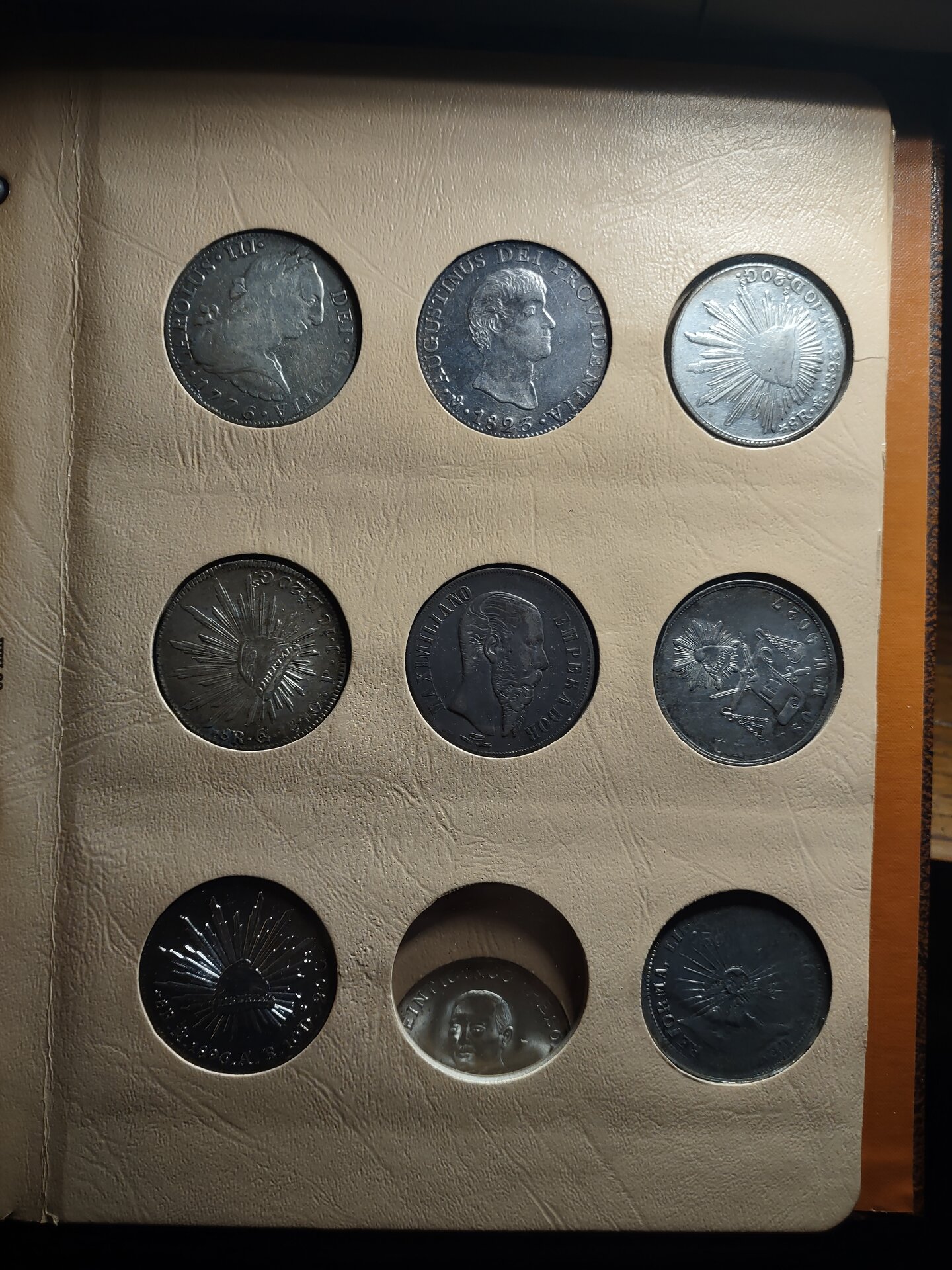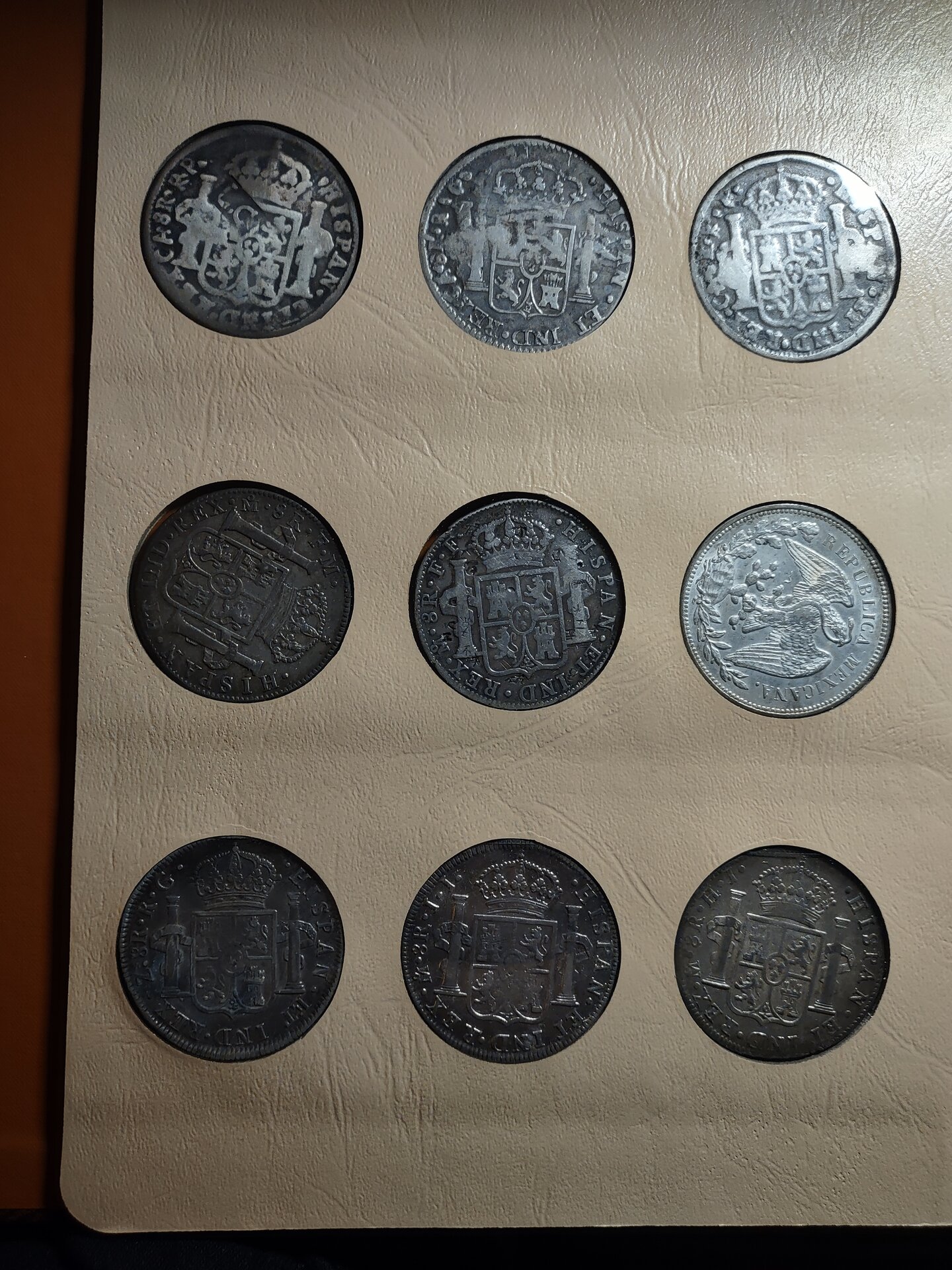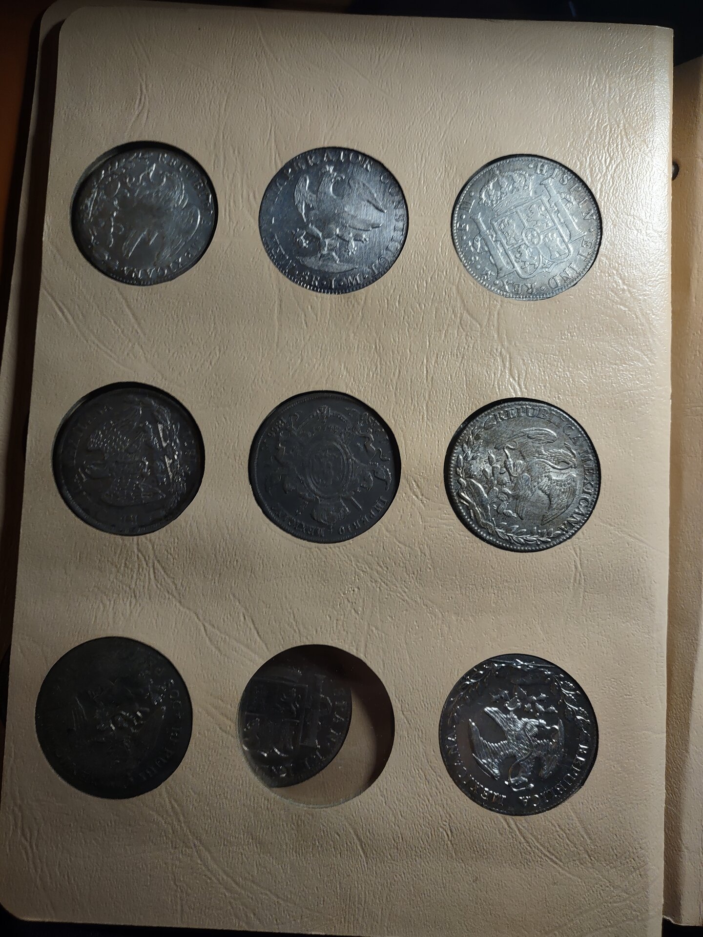 The top three coins on the first page are from the Mexican War for Independence, 1810 - 1821, by the royalists. If I'm not mistaken, the left and right coins are cast, and genuine, patterned on struck coins from the Mexico City Mint. The middle coin looks as if it was struck over another coin, possibly cast. The coins were countermarked by the issuing authorities, but I can't really make out the ones on your coins. The coin on the left and the one on the right were minted in Chihuahua, and the middle coin is from Durango.