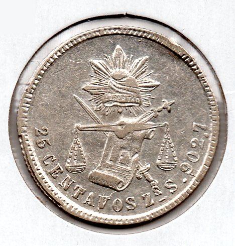 Here's another: Mexico - 25 Centavos - 1880 Zs KM406.9 - 6.7680g - 0.9027Ag - 0.1965oz Mexico - 25 Centavos - 1886 Zs S - Brass