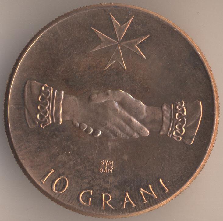 10 grani 1971, copper-zinc-nickel (91% - 8% - 1%), size - 30 mm, weight - 8 g., mintage - 50000 pcs. Engraver: Pietro Giampaoli. Minted in Rome.