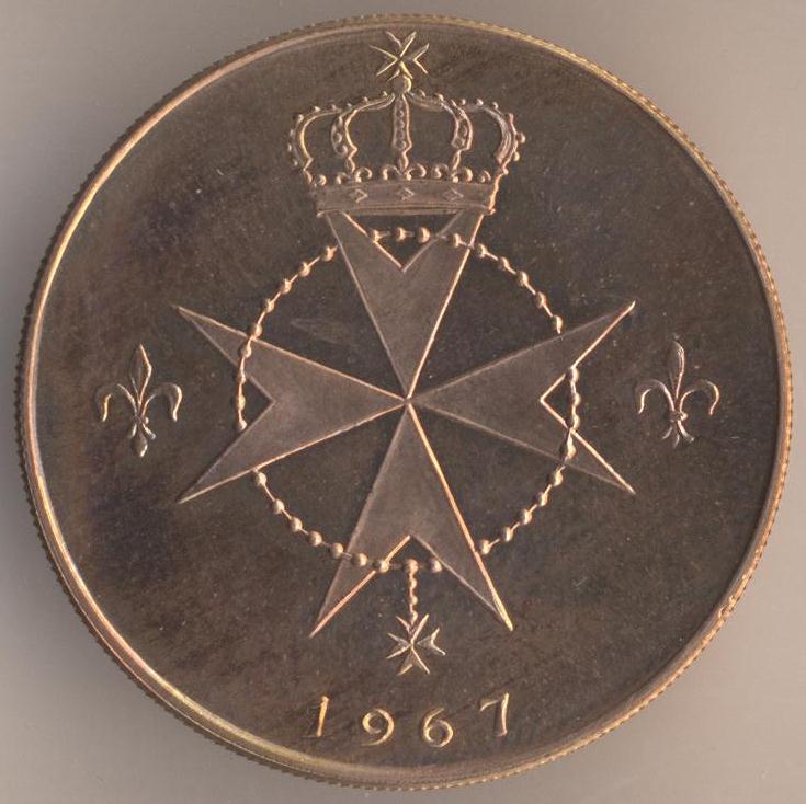 I found this item in a California coin dealer's "junk box" in 2014: Obverse: Two knights fighting / QUADRICENTENNIAL OF THE GREAT SIEGE OF MALTA / 1565 1965 Reverse: Double headed eagle holding scepter and crown / SOVEREIGN ORDER OF SAINT JOHN OF JERUSALEM / MXLVIII (1043) Franklinium, 32mm, 16.79gm This item was part of a set manufactured by the Franklin Mint of Pennsylvania for a modern version of the order known as the "Sovereign Order of Saint John of Jerusalem". "Franklinium" is an alloy created by the Franklin Mint. It is a copper-nickel alloy mixed with Columbium (Niobium).