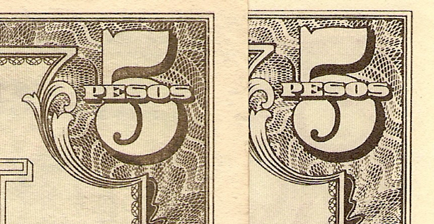 Here are the diagnostics for the Philippine counterfeit JIM, the genuine is on the left and counterfeit on the right: 50 centavo - The small curved line under the upper right counter is solid on the original but broken on the counterfeit. 1 peso - The fingers below the three circles are separated on the original but are joined on the counterfeit. 5 peso - The curved lines under the 5 remain separate on the original but join the border on the counterfeit. 10 peso - There is a small tick mark on the counterfeit between the 1 and 0 that is not there on the original.