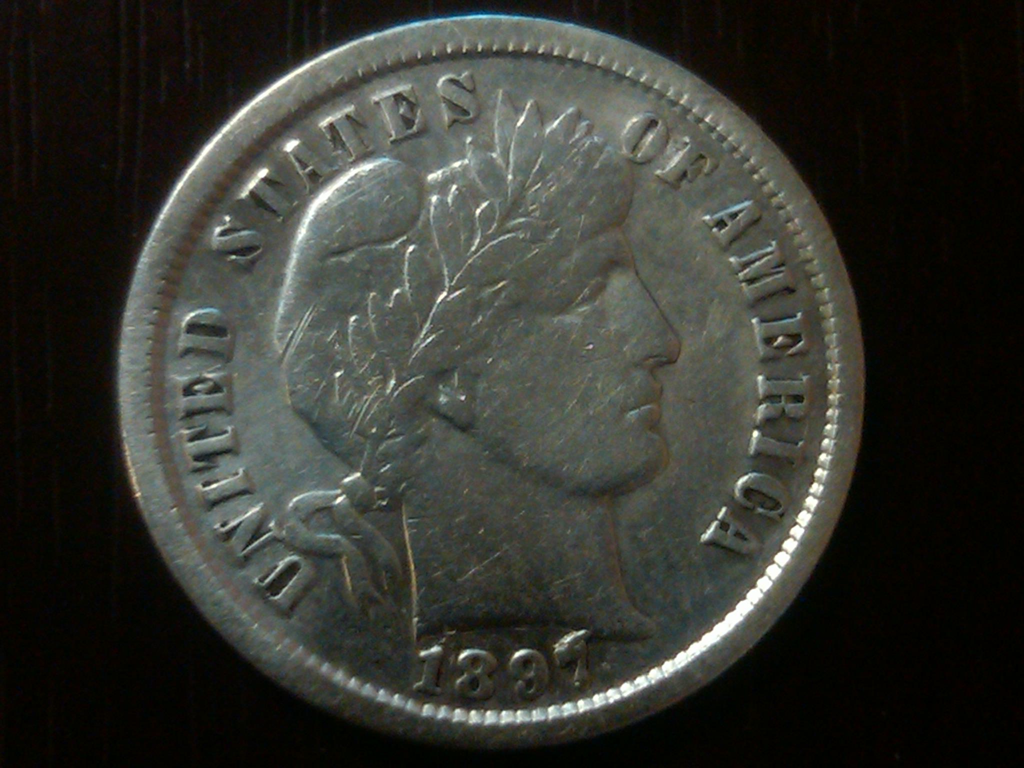 my 1897 barber dime, with what i assume is a die chip above the 7. sorry for the poor quality pic, looking to upgrade soon.