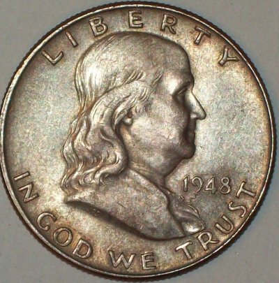 Looks like a great thread to add this coin and some questions. I have several hundred UNC Franklins with this pinkish look. Any idea of what storage method would have caused it? PCGS is good with the this look but I don't see very many Franklins with this color.