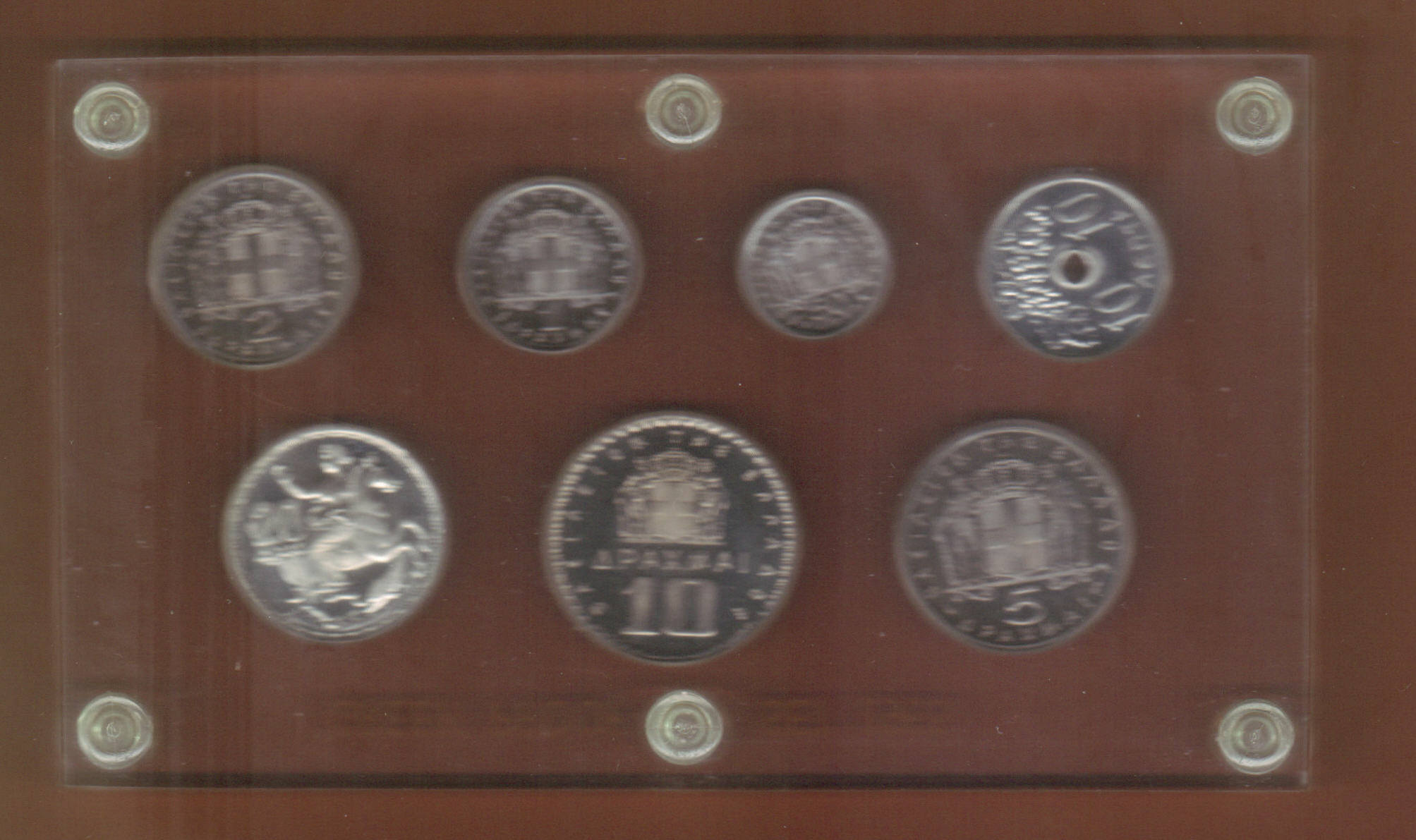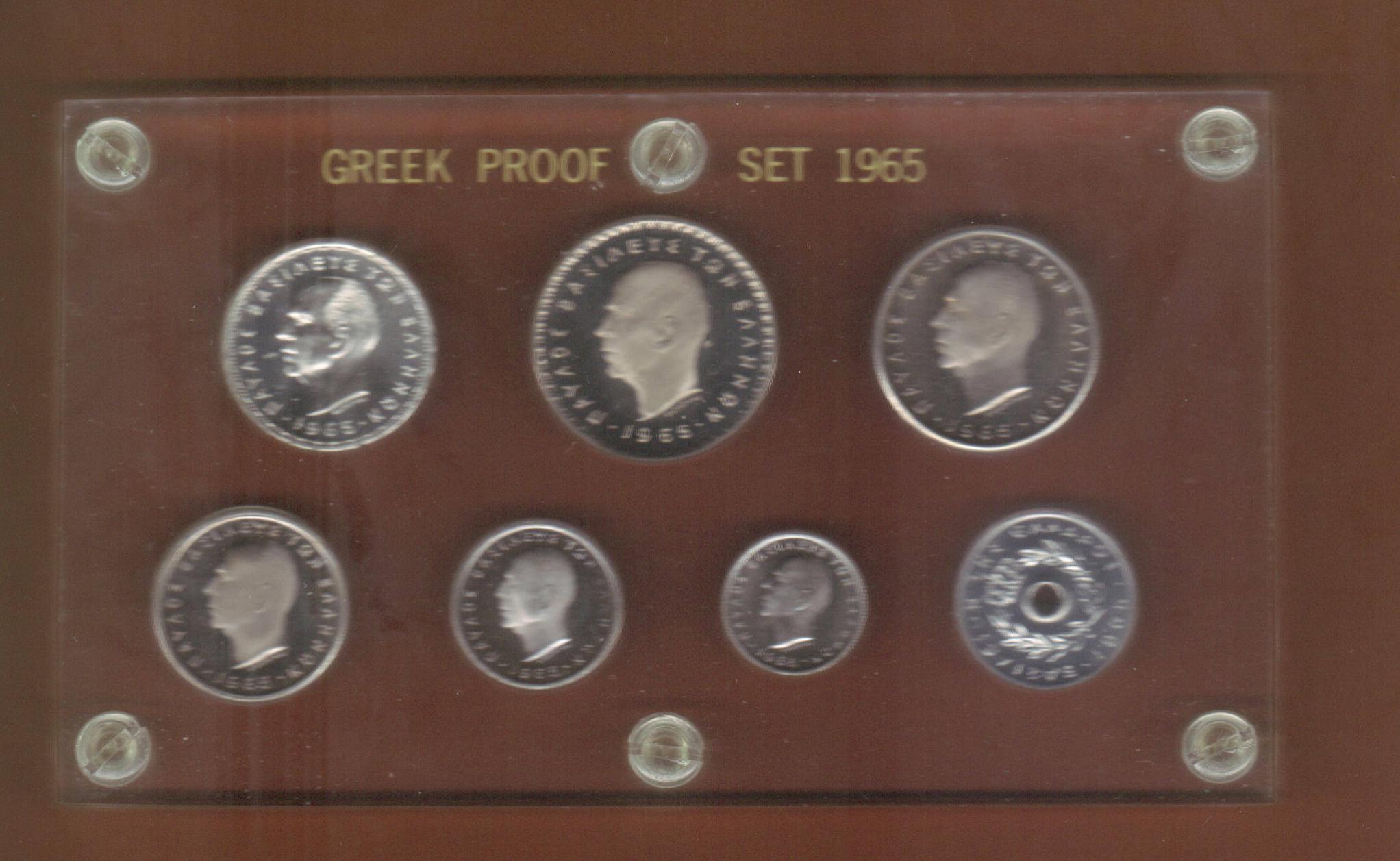 1965 Greece Proof Set, mintage 4,987 according to Krause. 2011 Krause catalog value, $100. The custom holder has a few scratches and scrapes, but the coins look fine. Price, $60 postpaid and insured. Shipped only to the United States. PayPal or money order, no cash please.
