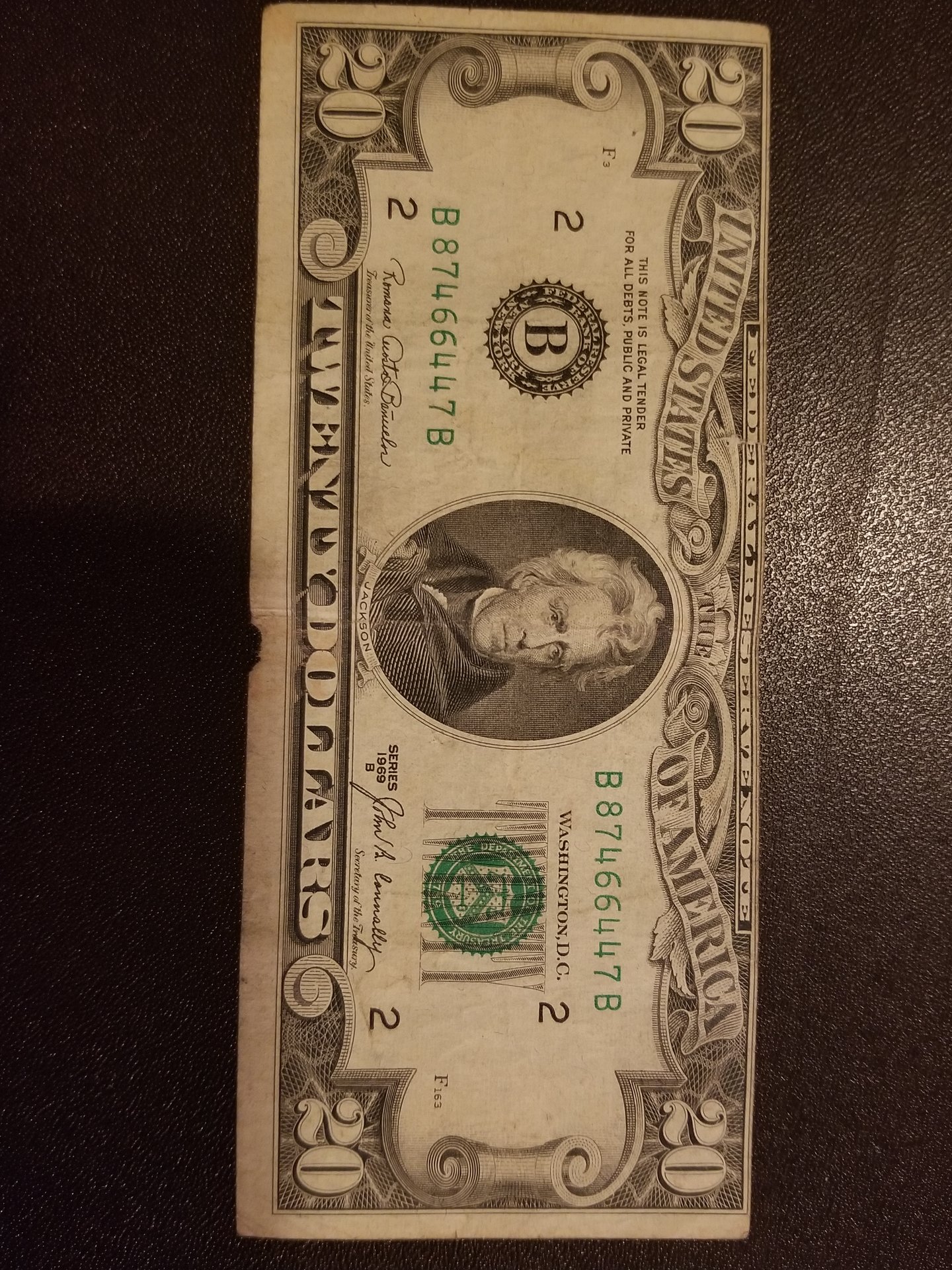 Miscut notes come in different variances, and typically officially become an error note when part of an adjoining note is visible. The OP’s $20 is a poorly centered note. If you hold US currency up to a bright light, and look at it from the back, you’ll notice the back design fits into the front design. How well it fits in is called registration. Poor centering is usually more noticeable on the front because of smaller margins. This sample is a minor error with a sliver of the adjoining note visible in the lower margin.