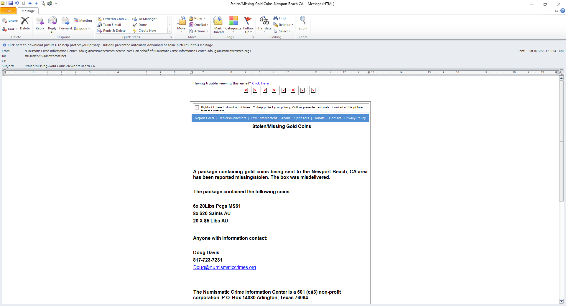 Below is an announcement from the NCIC . . . Doubtless the package was addressed to one of the many major US gold dealers in Newport Beach, and the delivery-person knew exactly who he / she was supposed to deliver to, bet big by changing the address to which it was supposedly delivered, won big, and is playing dumb on this one. I hope he / she gets steel bars for gold coins. Report Form | Dealers/Collectors | Law Enforcement | About | Sponsors | Donate | Contact | Privacy Policy Stolen/Missing Gold Coins A package containing gold coins being sent to the Newport Beach, CA area has been reported missing/stolen. The box was misdelivered. The package contained the following coins: 6x 20Libs Pcgs MS61 8x $20 Saints AU 20 X $5 Libs AU Anyone with information contact: Doug Davis 817-723-7231 Doug@numismaticcrimes.org The Numismatic Crime Information Center is a 501 (c)(3) non-profit corporation. P.O. Box 14080 Arlington, Texas 76094. Numismatic Crime Information Center