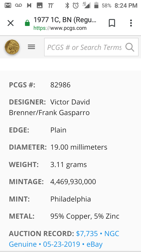 I believe the original post is showing that when you look up a 1977 Lincoln cent, the auction record shows up as $7,735. When you click on the actual item though, you see that the linked auction is not a 1977 cent but rather a Medal. This type of error is seen throughout Coin Facts, so one just has to be diligent when reviewing the information.
