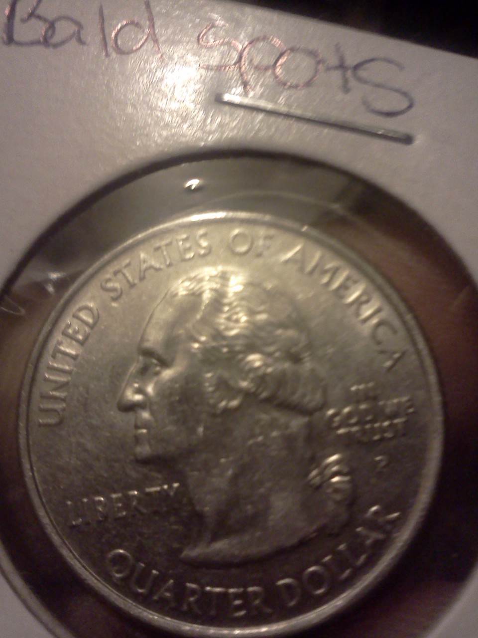 A better photo would be required... and take it out of the cardboard before photographing. You might want to circle the spots you are referring to, using any photo editing program. Also, on a side note, coins are "struck", not "printed". And welcome to CT!