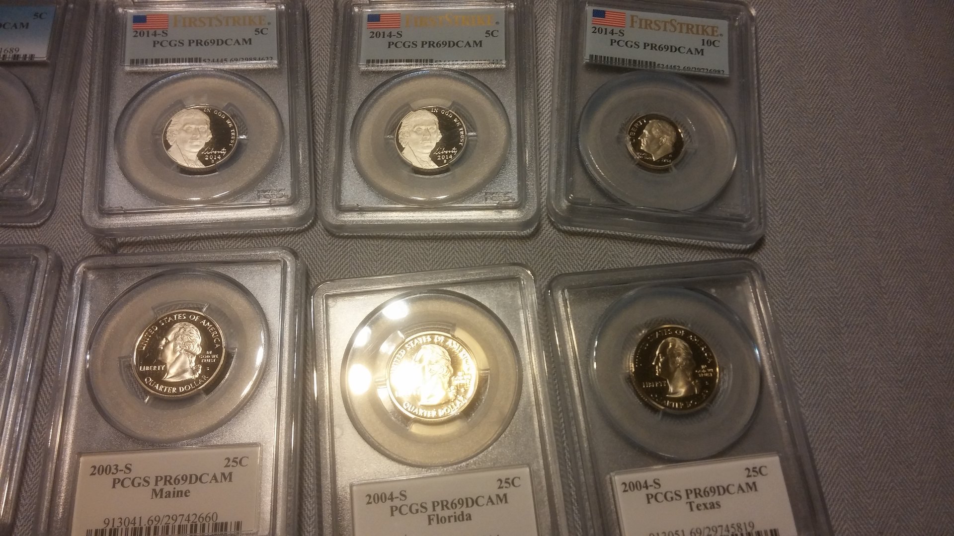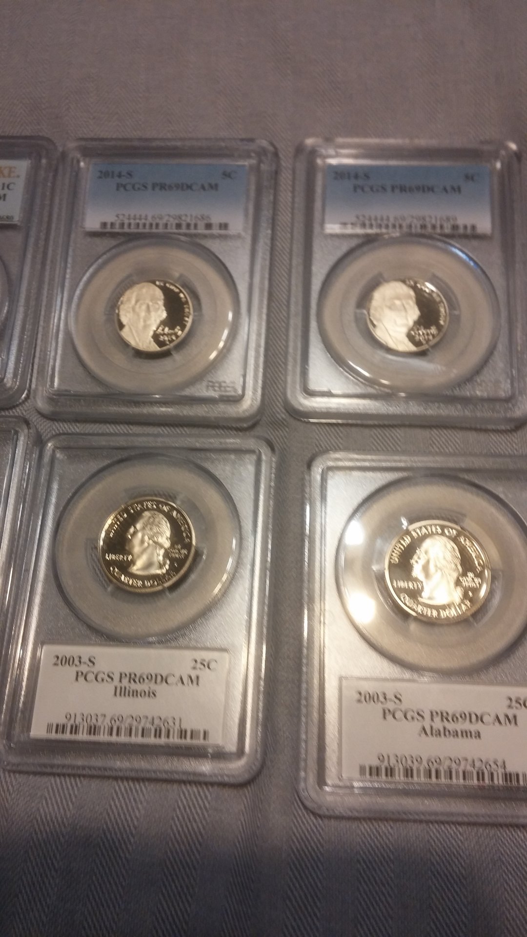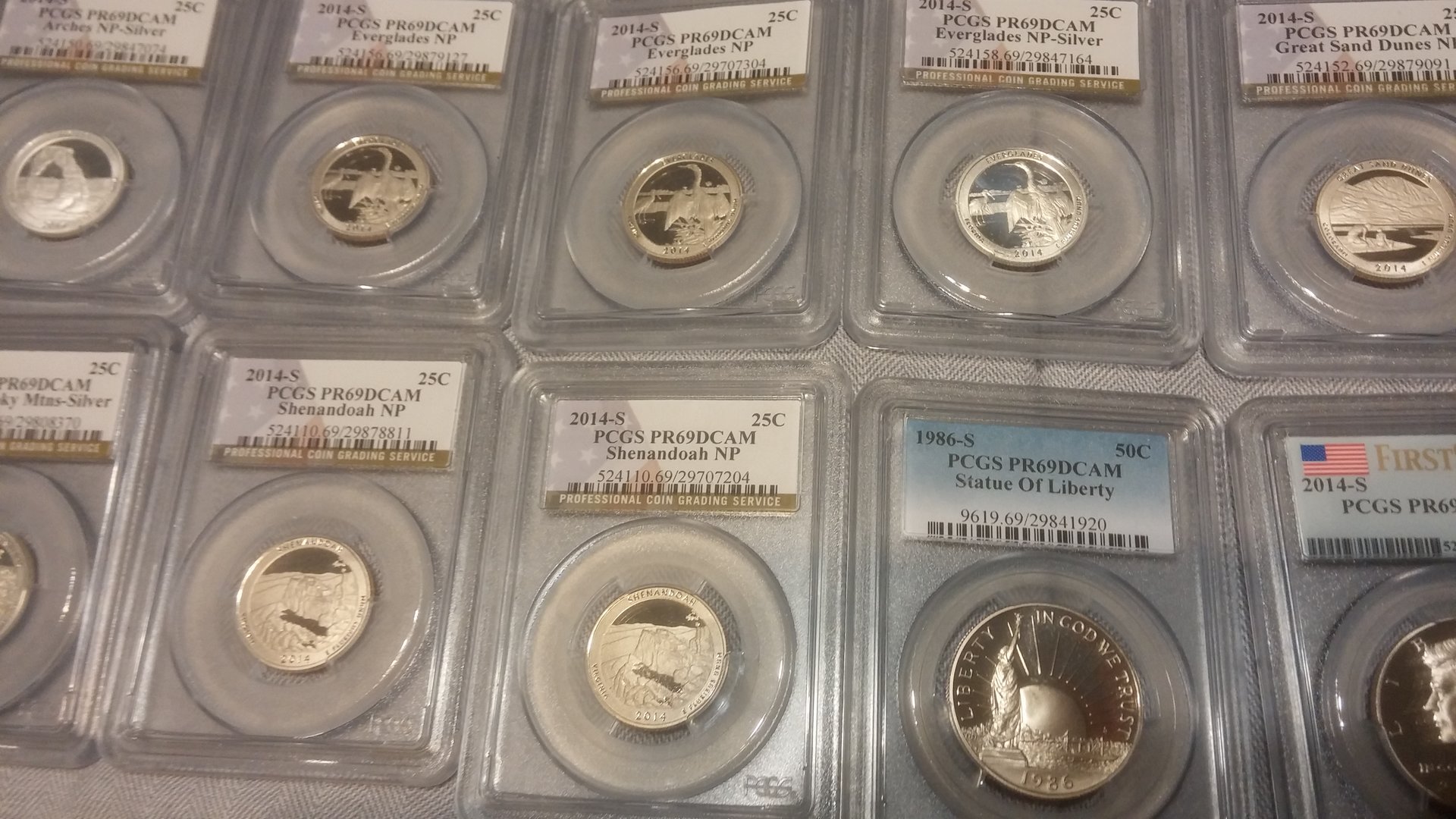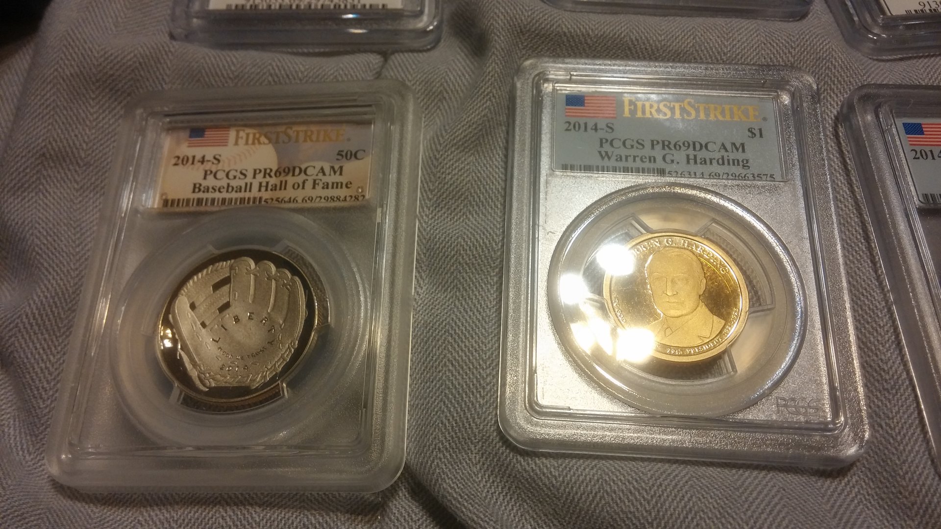 Currently looking to sell all of my more modern PCGS coins. Preferably would like to sell as one lot, but will break up into smaller lots. The values next to the coins are not my asking price, I was simply giving you the PCGS price guide value for each of them. Total Retail Value is $1064, I am looking for $625 shipped for the entire lot of coins. I would also be willing to entertain trades for silver, PCGS graded MS walkers / Standing Liberty Quarters, Indian cents. Open to all offers, would like to get these coins moved by this weekend, below are some pictures of the coins, if you have any interest, please PM me! Thank you for your time and consideration! PCGS Inventory • Lincoln Sheild Cent (Lyndall Bass Signature) 2010 S 1c PR69DCAM 416682.69 $25.00 • Lincoln Sheild Cent 2014 S 1c PR69DCAM 524425.69 $20.00 • Lincoln Sheild Cent 2014 S 1c PR69DCAM 524419.69 $12.00 • Jefferson Nickel 1943 D 5c MS66FS 84020.66 $46.00 • Jefferson Nickel 2014 S 5c PR69DCAM 524445.69 $15.00 • Jefferson Nickel 2014 S 5c PR69DCAM 524445.69 $15.00 • Jefferson Nickel 2014 S 5c PR69DCAM 524444.69 $12.00 • Jefferson Nickel 2014 S 5c PR69DCAM 524444.69 $12.00 • Roosevelt Dime 2004 S 10c PR69DCAM 95309.69 $18.00 • Roosevelt Dime 2014 S 10c PR69DCAM 524454.69 $17.00 • Roosevelt Dime 2014 S 10c PR69DCAM 524452.69 $15.00 • Illinois State Quarter 2003 S 25c PR69DCAM 913037.69 $17.00 • Alabama State Quarter 2003 S 25c PR69DCAM 913039.69 $17.00 • Maine State Quarter 2003 S 25c PR69DCAM 913041.69 $17.00 • Missouri State Quarter 2003 S 25c PR69DCAM 913043.69 $22.00 • Arkansas State Quarter 2003 S 25c PR69DCAM 913045.69 $16.00 • Michigan State Quarter 2004 S 25c PR69DCAM 913047.69 $17.00 • Florida State Quarter 2004 S 25c PR69DCAM 913049.69 $17.00 • Texas State Quarter 2004 S 25c PR69DCAM 913051.69 $21.00 • Iowa State Quarter 2004 S 25c PR69DCAM 913053.69 $17.00 • Wisconsin State Quarter 2004 S 25c PR69DCAM 913055.69 $17.00 • Great Smoky Mtns NP 2014 S 25c PR69DCAM 524105.69 $15.00 • Great Smoky Mtns NP 2014 S 25c PR69DCAM 524105.69 $15.00 • Great Smoky Mtns NP 2014 S 25c PR69DCAM 524107.69 $17.00 • Shenandoah NP 2014 S 25c PR69DCAM 524110.69 $15.00 • Shenandoah NP 2014 S 25c PR69DCAM 524110.69 $15.00 • Arches NP 2014 S 25c PR69DCAM 524145.69 $15.00 • Arches NP 2014 S 25c PR69DCAM 524145.69 $15.00 • Arches NP 2014 S 25c PR69DCAM 524150.69 $17.00 • Great Sand Dunes NP 2014 S 25c PR69DCAM 524152.69 $15.00 • Great Sand Dunes NP 2014 S 25c PR69DCAM 524152.69 $15.00 • Great Sand Dunes NP 2014 S 25c PR69DCAM 524154.69 $17.00 • Everglades NP 2014 S 25c PR69DCAM 524156.69 $15.00 • Everglades NP 2014 S 25c PR69DCAM 524156.69 $15.00 • Everglades NP 2014 S 25c PR69DCAM 524158.69 $17.00 • Statue of Liberty 1986 S 50c PR69DCAM 9619.69 $22.00 • Kennedy Half 2014 S 50c PR69DCAM 524467.69 $18.00 • Kennedy Half 2014 S 50c PR69DCAM 524467.69 $18.00 • Kennedy Half 2014 S 50c PR69DCAM 524467.69 $18.00 • Kennedy Half 2014 S 50c PR69DCAM 528364.69 $47.00 • 2014-S Baseball HOF 2014 S 50c PR69DCAM 525646.69 $75.00 • George Washington Dollar 2007 D $1 MS66 148053.66 $10.00 • George Wahington Dollar FDI 2007 P $1 MS66 148105.66 $10.00 • Jefferson Dollar FDI Position A 2007 D $1 MS66 148110.66 $10.00 • James Madison FDI Position A 2007 P $1 MS66 148111.69 $7.00 • James Madison FDI Position A 2007 D $1 MS66 148112.69 $10.00 • John Adams FDI Position B 2007 P $1 MS66 150218.66 $10.00 • John Adams FDI Position B 2007 D $1 MS66 150220.66 $10.00 • Jefferson Dollar FDI Position B 2007 D $1 MS66 150224.66 $10.00 • James Monroe FDI Position A 2008 P $1 MS66 394651.66 $10.00 • James Monroe FDI Position B 2008 P $1 MS66 394653.66 $10.00 • James Monroe FDI Position A 2008 D $1 MS66 394657.66 $10.00 • James Monroe FDI Position B 2008 D $1 MS66 394658.66 $10.00 • Susan B. Anthony Dollar 1980 S $1 PR69DCAM 99592.69 $26.00 • FDR Dollar 2014 S $1 PR69DCAM 526311.69 $16.00 • Herbert Hoover Dollar 2014 S $1 PR69DCAM 526312.69 $15.00 • Calvin Coolidge Dollar 2014 S $1 PR69DCAM 526313.69 $15.00 • Warren G. Harding Dollar 2014 S $1 PR69DCAM 526314.69 $15.00 • Native American Dollar 2014 S $1 PR69DCAM 527065.69 $17.00 • Native American Dollar 2014 S $1 PR69DCAM 527066.69 $18.00 NGC • Sacagawea Dollar (Graded by NGC) 2008 S $1 PF69UCAM 3249514-103 $24.00 Total Retail Value (Via PCGS Price Guide: $1,064.00