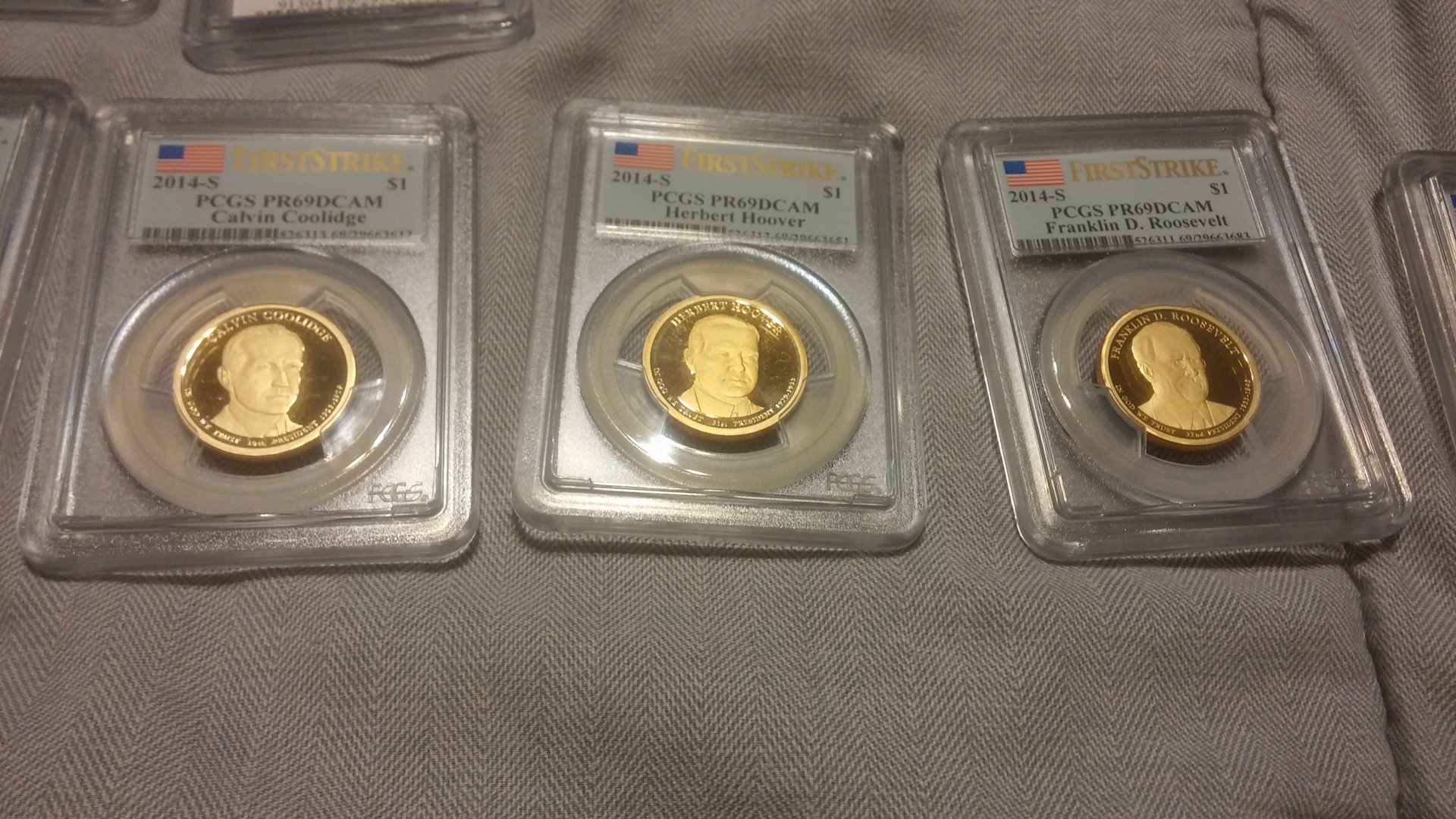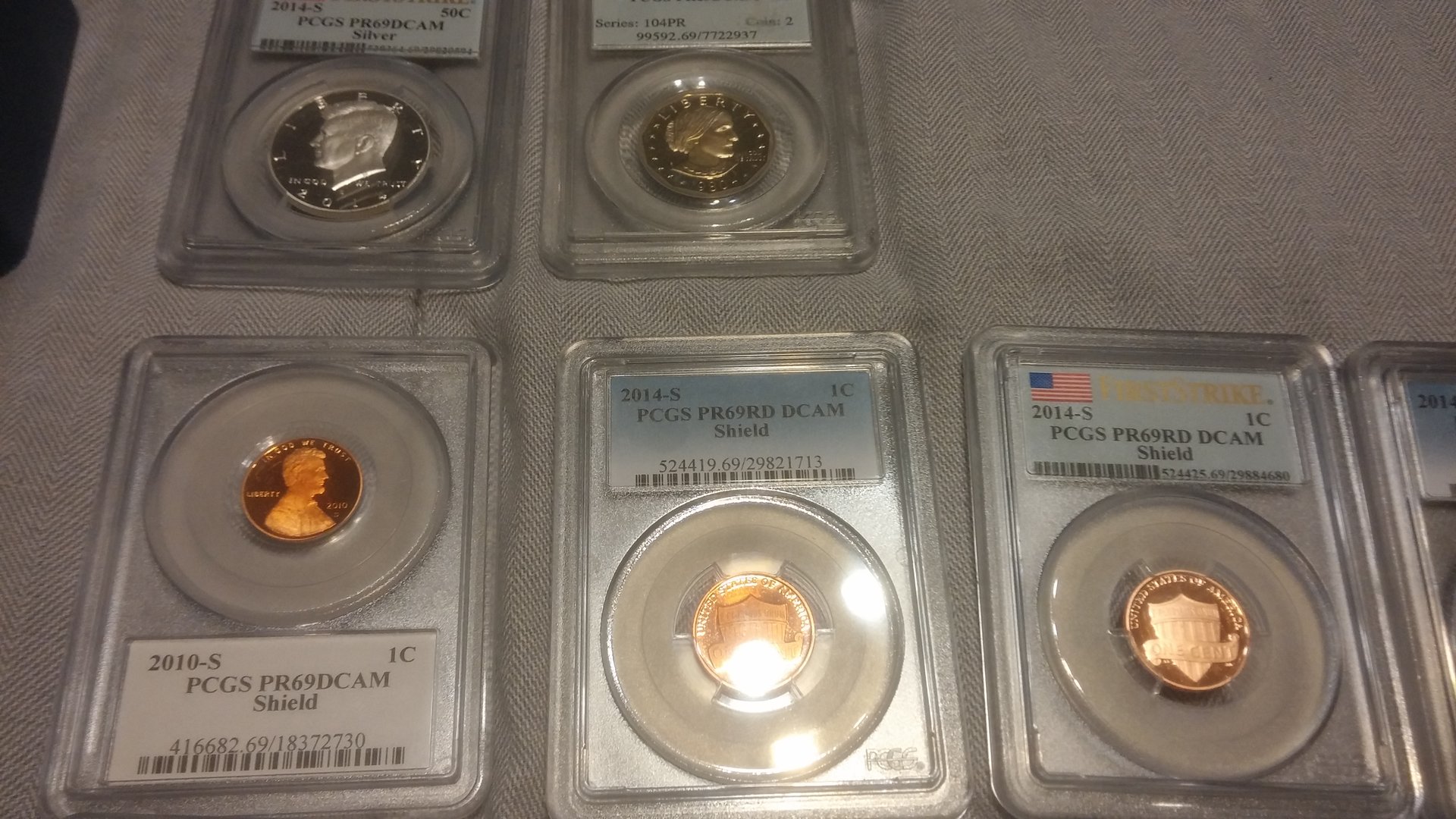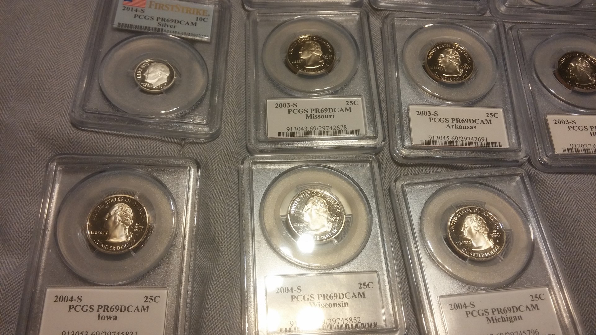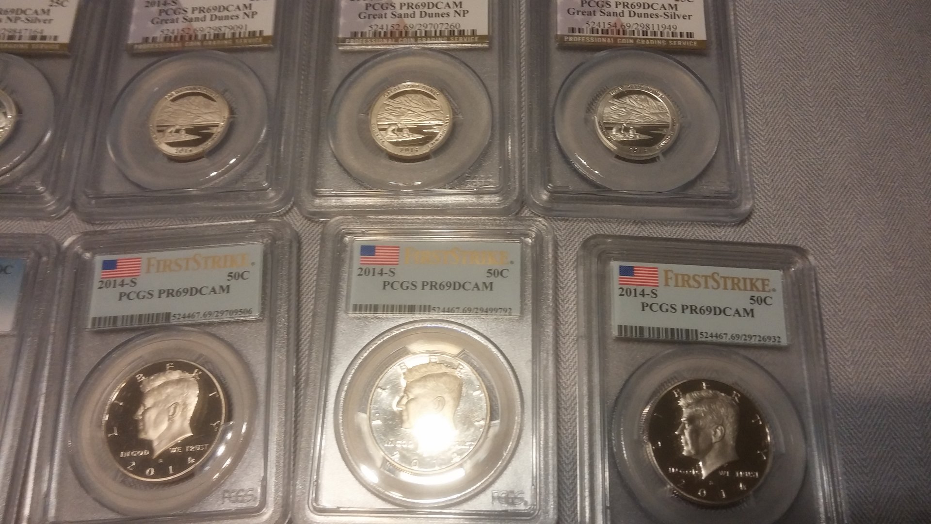 Currently looking to sell all of my more modern PCGS coins. Preferably would like to sell as one lot, but will break up into smaller lots. The values next to the coins are not my asking price, I was simply giving you the PCGS price guide value for each of them. Total Retail Value is $1064, I am looking for $625 shipped for the entire lot of coins. I would also be willing to entertain trades for silver, PCGS graded MS walkers / Standing Liberty Quarters, Indian cents. Open to all offers, would like to get these coins moved by this weekend, below are some pictures of the coins, if you have any interest, please PM me! Thank you for your time and consideration! PCGS Inventory • Lincoln Sheild Cent (Lyndall Bass Signature) 2010 S 1c PR69DCAM 416682.69 $25.00 • Lincoln Sheild Cent 2014 S 1c PR69DCAM 524425.69 $20.00 • Lincoln Sheild Cent 2014 S 1c PR69DCAM 524419.69 $12.00 • Jefferson Nickel 1943 D 5c MS66FS 84020.66 $46.00 • Jefferson Nickel 2014 S 5c PR69DCAM 524445.69 $15.00 • Jefferson Nickel 2014 S 5c PR69DCAM 524445.69 $15.00 • Jefferson Nickel 2014 S 5c PR69DCAM 524444.69 $12.00 • Jefferson Nickel 2014 S 5c PR69DCAM 524444.69 $12.00 • Roosevelt Dime 2004 S 10c PR69DCAM 95309.69 $18.00 • Roosevelt Dime 2014 S 10c PR69DCAM 524454.69 $17.00 • Roosevelt Dime 2014 S 10c PR69DCAM 524452.69 $15.00 • Illinois State Quarter 2003 S 25c PR69DCAM 913037.69 $17.00 • Alabama State Quarter 2003 S 25c PR69DCAM 913039.69 $17.00 • Maine State Quarter 2003 S 25c PR69DCAM 913041.69 $17.00 • Missouri State Quarter 2003 S 25c PR69DCAM 913043.69 $22.00 • Arkansas State Quarter 2003 S 25c PR69DCAM 913045.69 $16.00 • Michigan State Quarter 2004 S 25c PR69DCAM 913047.69 $17.00 • Florida State Quarter 2004 S 25c PR69DCAM 913049.69 $17.00 • Texas State Quarter 2004 S 25c PR69DCAM 913051.69 $21.00 • Iowa State Quarter 2004 S 25c PR69DCAM 913053.69 $17.00 • Wisconsin State Quarter 2004 S 25c PR69DCAM 913055.69 $17.00 • Great Smoky Mtns NP 2014 S 25c PR69DCAM 524105.69 $15.00 • Great Smoky Mtns NP 2014 S 25c PR69DCAM 524105.69 $15.00 • Great Smoky Mtns NP 2014 S 25c PR69DCAM 524107.69 $17.00 • Shenandoah NP 2014 S 25c PR69DCAM 524110.69 $15.00 • Shenandoah NP 2014 S 25c PR69DCAM 524110.69 $15.00 • Arches NP 2014 S 25c PR69DCAM 524145.69 $15.00 • Arches NP 2014 S 25c PR69DCAM 524145.69 $15.00 • Arches NP 2014 S 25c PR69DCAM 524150.69 $17.00 • Great Sand Dunes NP 2014 S 25c PR69DCAM 524152.69 $15.00 • Great Sand Dunes NP 2014 S 25c PR69DCAM 524152.69 $15.00 • Great Sand Dunes NP 2014 S 25c PR69DCAM 524154.69 $17.00 • Everglades NP 2014 S 25c PR69DCAM 524156.69 $15.00 • Everglades NP 2014 S 25c PR69DCAM 524156.69 $15.00 • Everglades NP 2014 S 25c PR69DCAM 524158.69 $17.00 • Statue of Liberty 1986 S 50c PR69DCAM 9619.69 $22.00 • Kennedy Half 2014 S 50c PR69DCAM 524467.69 $18.00 • Kennedy Half 2014 S 50c PR69DCAM 524467.69 $18.00 • Kennedy Half 2014 S 50c PR69DCAM 524467.69 $18.00 • Kennedy Half 2014 S 50c PR69DCAM 528364.69 $47.00 • 2014-S Baseball HOF 2014 S 50c PR69DCAM 525646.69 $75.00 • George Washington Dollar 2007 D $1 MS66 148053.66 $10.00 • George Wahington Dollar FDI 2007 P $1 MS66 148105.66 $10.00 • Jefferson Dollar FDI Position A 2007 D $1 MS66 148110.66 $10.00 • James Madison FDI Position A 2007 P $1 MS66 148111.69 $7.00 • James Madison FDI Position A 2007 D $1 MS66 148112.69 $10.00 • John Adams FDI Position B 2007 P $1 MS66 150218.66 $10.00 • John Adams FDI Position B 2007 D $1 MS66 150220.66 $10.00 • Jefferson Dollar FDI Position B 2007 D $1 MS66 150224.66 $10.00 • James Monroe FDI Position A 2008 P $1 MS66 394651.66 $10.00 • James Monroe FDI Position B 2008 P $1 MS66 394653.66 $10.00 • James Monroe FDI Position A 2008 D $1 MS66 394657.66 $10.00 • James Monroe FDI Position B 2008 D $1 MS66 394658.66 $10.00 • Susan B. Anthony Dollar 1980 S $1 PR69DCAM 99592.69 $26.00 • FDR Dollar 2014 S $1 PR69DCAM 526311.69 $16.00 • Herbert Hoover Dollar 2014 S $1 PR69DCAM 526312.69 $15.00 • Calvin Coolidge Dollar 2014 S $1 PR69DCAM 526313.69 $15.00 • Warren G. Harding Dollar 2014 S $1 PR69DCAM 526314.69 $15.00 • Native American Dollar 2014 S $1 PR69DCAM 527065.69 $17.00 • Native American Dollar 2014 S $1 PR69DCAM 527066.69 $18.00 NGC • Sacagawea Dollar (Graded by NGC) 2008 S $1 PF69UCAM 3249514-103 $24.00 Total Retail Value (Via PCGS Price Guide: $1,064.00