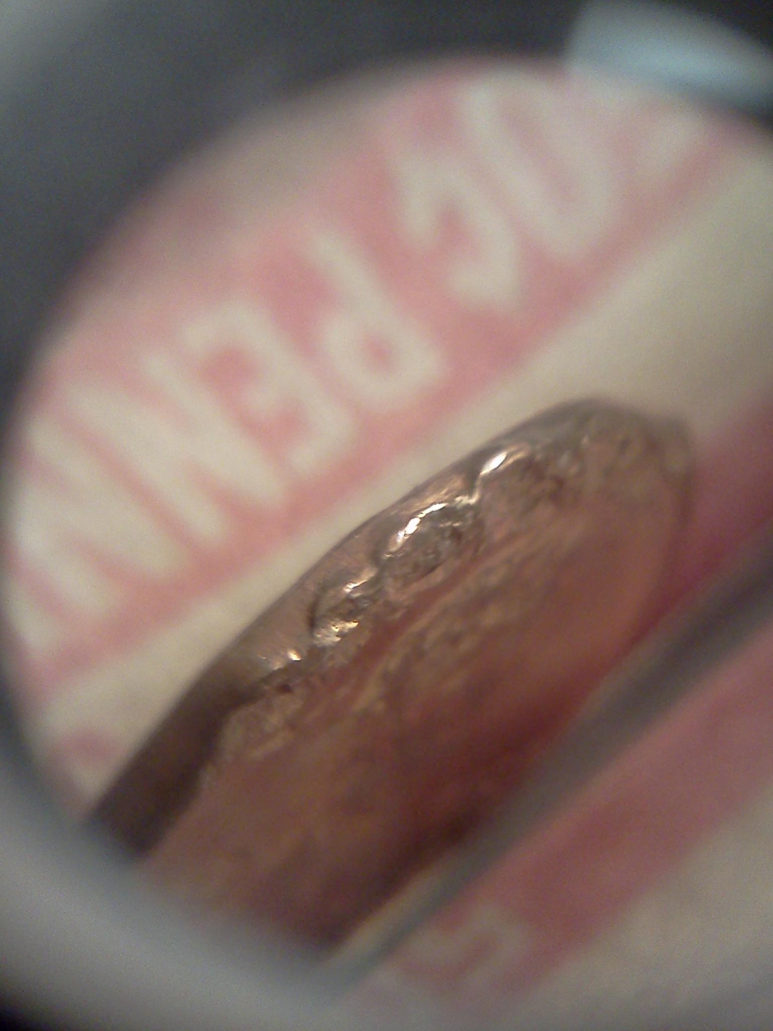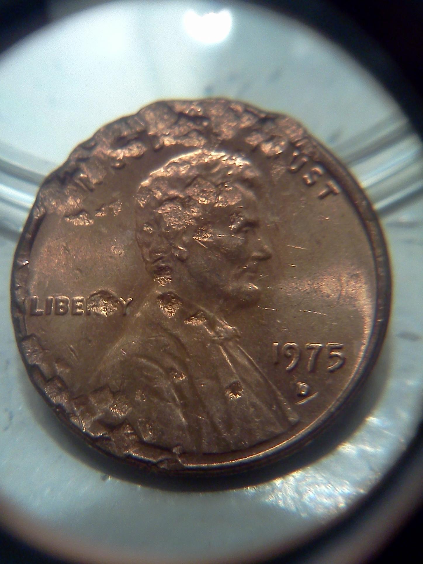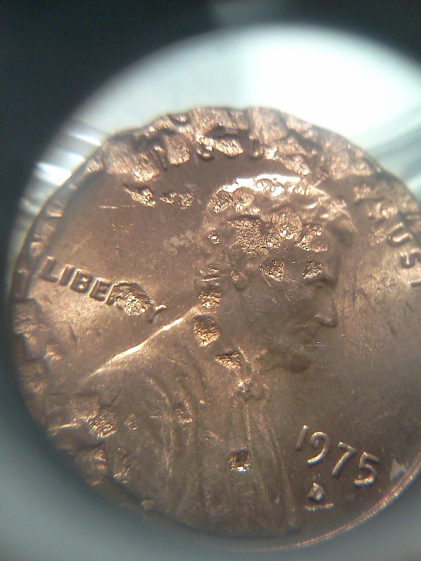 So here is an oddity. It looks like Lincoln has been attacked. My first suspicion was that the penny was imprinted by a rough surface like gravel or that it was chemically burned, but neither of these fully seem right... 1. The rough surface is ONLY on the observe. 2. The reverse shows NO damage or flaws. 3. The edge shows copper was displaced by pressure. 4. Also, near LIBERTY shows odd stamping pattern. 5. BUT, the imprints show a very odd texture, pics the best I can. It is a very rough texture which made me think a chemical burn...it is only in the indentations. Could a messed up die do this? Or a science project? Or....a MONSTEEEEEEEEEER!