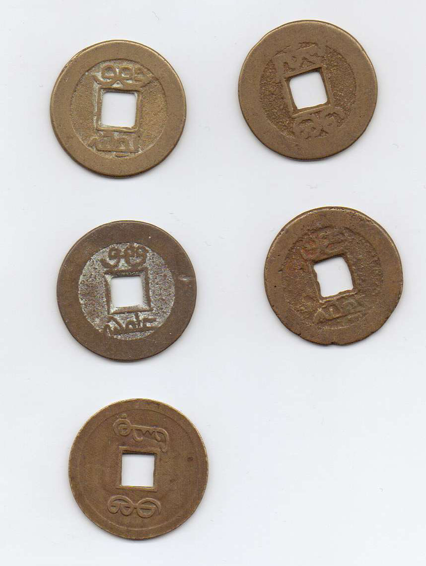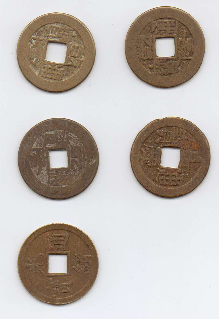 I have five more Chinese coins and I'd appreciate any help identifying them. I normally wouldn't buy something like this but I heard that they might be older than they look so I thought it was worth a chance. They are in the same spot in both the front and back pictures. If you can't see them well enough to read them I understand, but I don't know anything about them so any help as far as year/dynasty and denomination would be great.