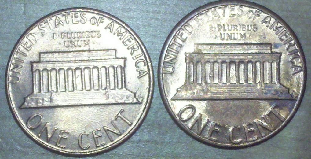 Not sure if this is an optical illusion because the cent is worn but the whole design looks bigger and looks closer to the rim. The coins are the same diameter but the worn cen t is .0015 thinner.