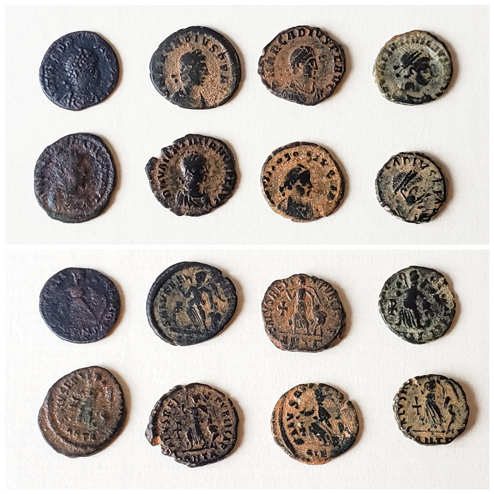 I'd gone through a spurt (well, maybe 2 or 3) where I picked up 1 or more of this late Roman SALVS REIPVBLICAE AE4 type. I haven't taken them all out and gotten them together for a while, so this thread was a good excuse. The emperors include Arcadius (he sounds like a fun dude), Theodosius I, Valentinian II (and I might have an Honorius in there too...? I didn't check). Some have a Chi-Rho, some a Cross. They are usually pretty cheap, and being a designer, I like the visual/graphic-ness of them. Specifically, my fave is the Arcadius, top row, third from the left... The sandy "patina" contrasting the black tone, and big graphic font. And it has nice detail and strike for the type.