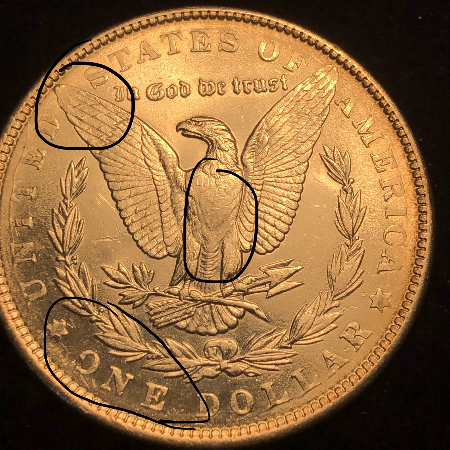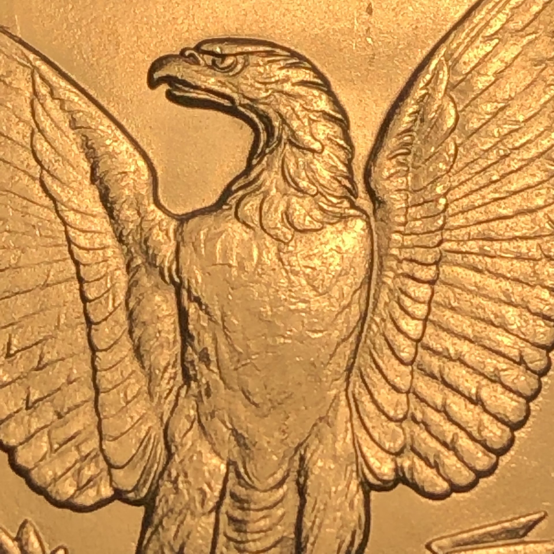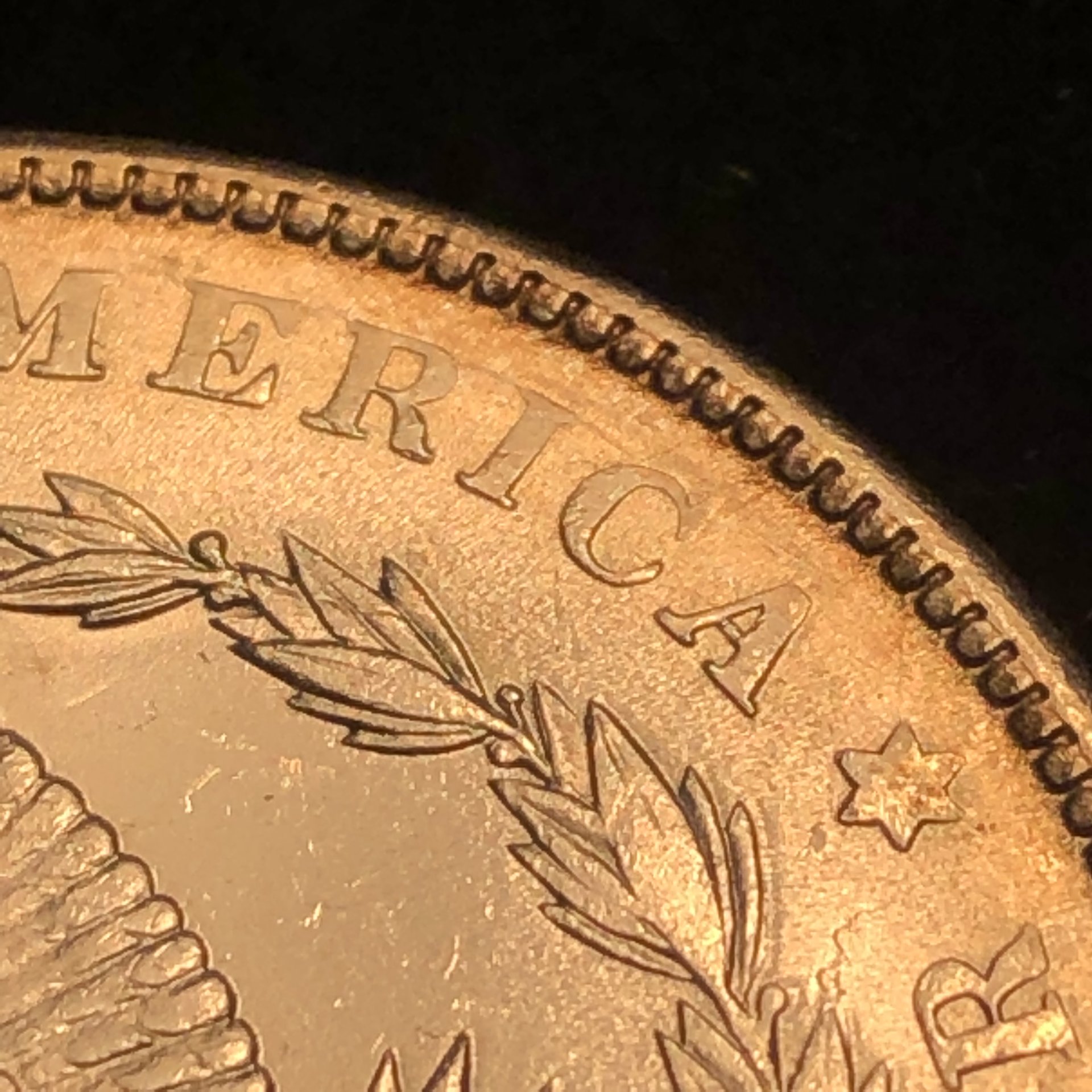 You got the idea The detail simply cannot be there because the metal on the top of that leaf never touched the die. And the reason that leaf has the texture to it is due to the same thing, and because the metal does not, simply cannot lift in a single flat plane. When metal is flowing it sorta bubbles up kind of like lava does - if and until it touches a hard surface for it to flow against and take on the shape of that surface. Which of course brings up a point that Mike raised, weakly stuck areas will never have luster. Which of course is another tell-tale of a weak strike. And, what's more, the textured surface will be of a different color than wear. Wear is always slightly darker than an area that was weakly struck. Of course, neither one will have luster - but for different reasons. With wear, the luster is worn away, with weak strike the luster never gets a chance to exist because the metal never touches the die.