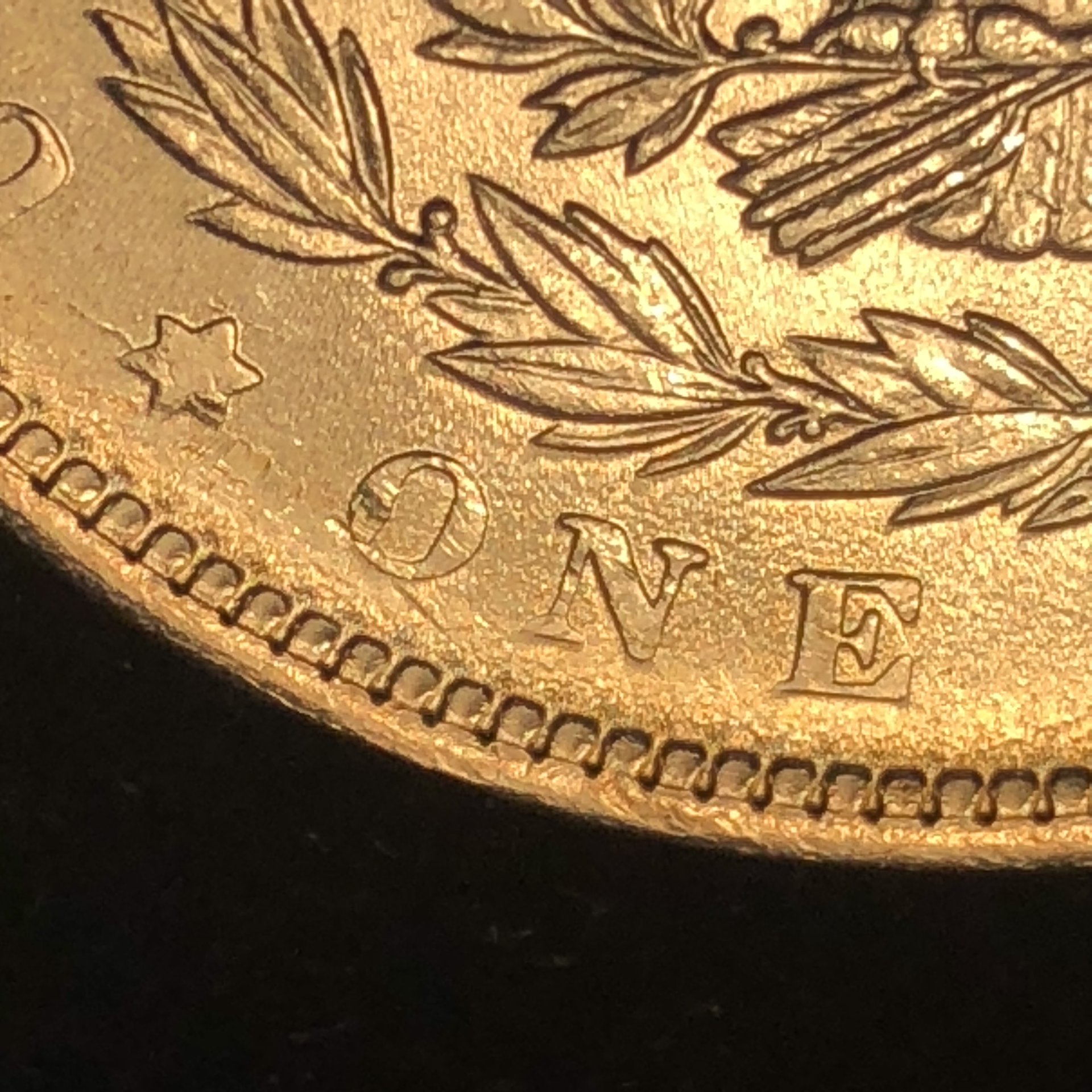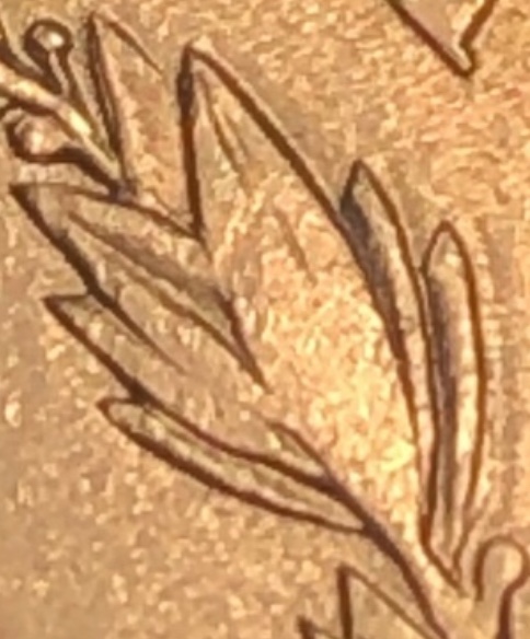 Doug, let me see if I understand what you’re saying. Here’s the leaf cluster, isolated... That top leaf you’re calling a “weak strike” was cut deeper into the die than those adjacent, lower leaves, which, given their detail in this photo as compared to the lack of detail in the top leaf in the photo, took the force of the strike better, because, again, those leaves weren’t cut as deep into the die as that top leaf was. That is to say, had the striking force been greater, that top leaf would have “taken” better, and we’d see that greater detail in the cut of the top leaf imparted to the planchet. Bottom line, the striking force was insufficient to fill that deeper cavity of the top leaf, and that’s why it wasn’t imparted to the planchet. Is that basically how you’re seeing it? PS: BTW, that reminds me, I need to see a dentist (cavities).
