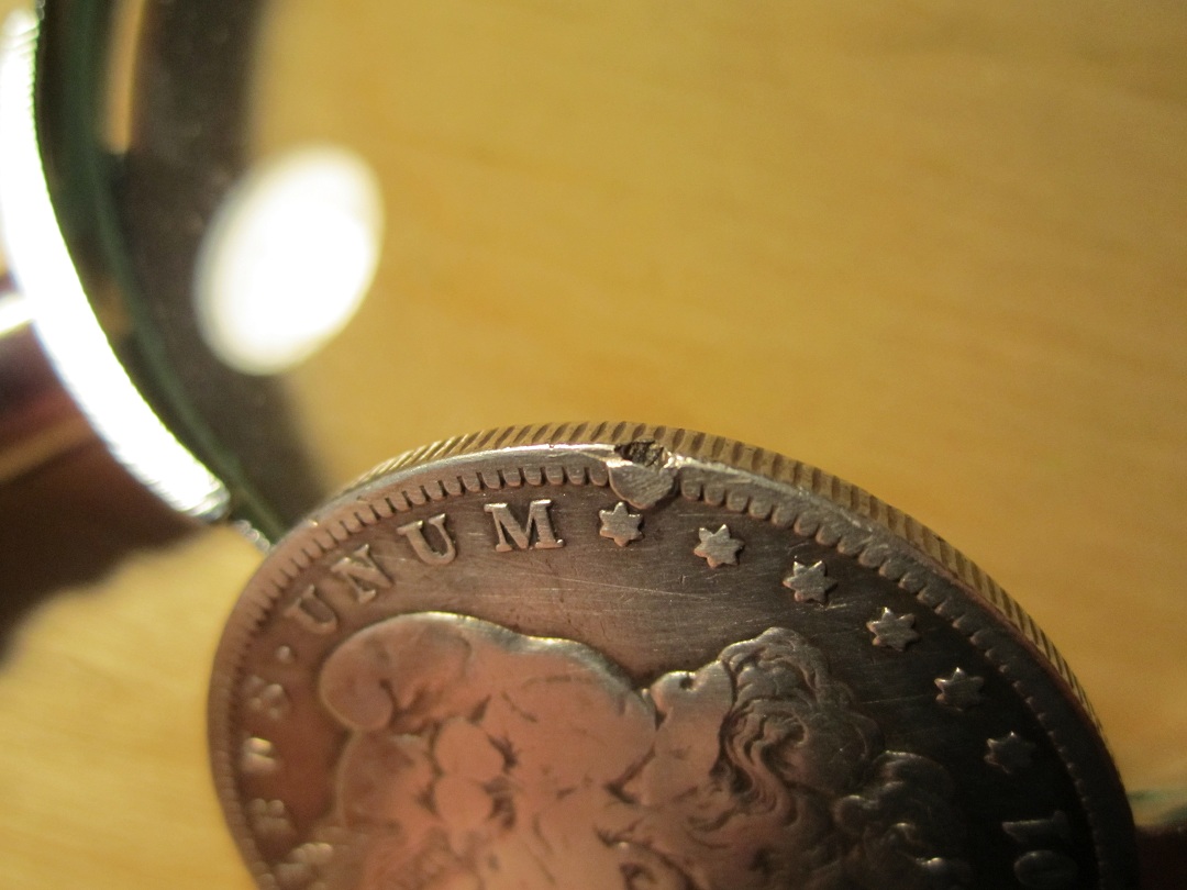 in one of the batches of morgans i bought this one had a v shaped hole in it and the silver on top looks like it was pushed down..thanks in advance
