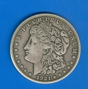 From my colliction Morgan dollar 1921 ( S) Specifications: Designer: George T. Morgan Circulation Mintage: high 44,690,000 (1921), low 12,000 (1895, but none are known, possibly all having been melted. Next lowest at 77,000 pieces is the 1893-S). Proof Mintage: high 1,355 (1880), low 590 (1890. A small number of proofs have been listed from the New Orleans, Carson City, and San Francisco mints, though unconfirmed by official records and considered by some to be exceptional business strikes. The San Francisco pieces were apparently made at the request of Farran Zerbe, President of the American Numismatic Association from 1908 to 1910, and Henry Chapman, a Philadelphia coin dealer in the early 1900s). Denomintion: $1.00 One Dollar Diameter: ±38.1 mm, reeded edge Metal content: 90% silver, 10% copper Weight: ±26.73 grams Varieties:Hundreds of varieties are known for this extensively studied series of U.S. coinage. A reference on Morgan varieties was published in 1964, at the end of the earlier period of Treasury Department silver dollar distribution, but interest expanded greatly following the 1971 publication of a comprehensive variety book by Leroy Van Allen and A. George Mallis. The most sought-after VAM varieties (after Van Allen and Mallis) are divided into two groups, the Top-100 and the Hot-50. Of more general interest to the non-specialist are the 1878 seven/eight tail feathers versions; the 1878/1879/1880 reverse varieties; the 1879-CC/CC; 1880/79-O and S overdates; 1882-O/S; 1887/6 O and Philadelphia overdates; 1888-O double die obverse; 1899-O Micro mintmark; 1900 O/CC; 1901 double die reverse; and the 1903-S Micro S mintmark.