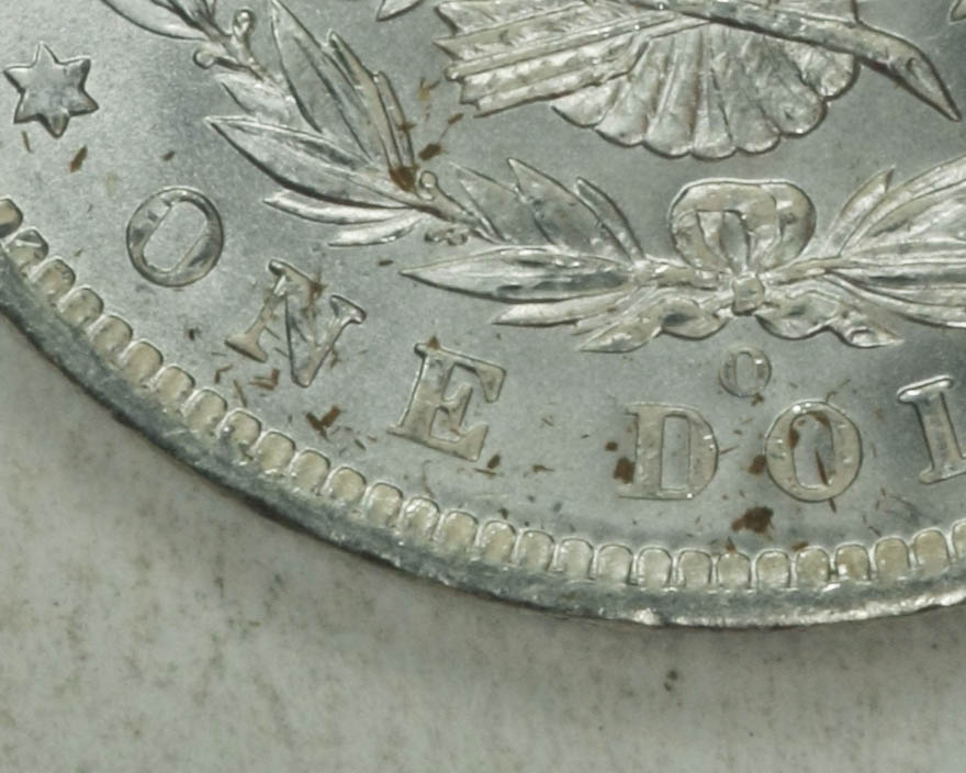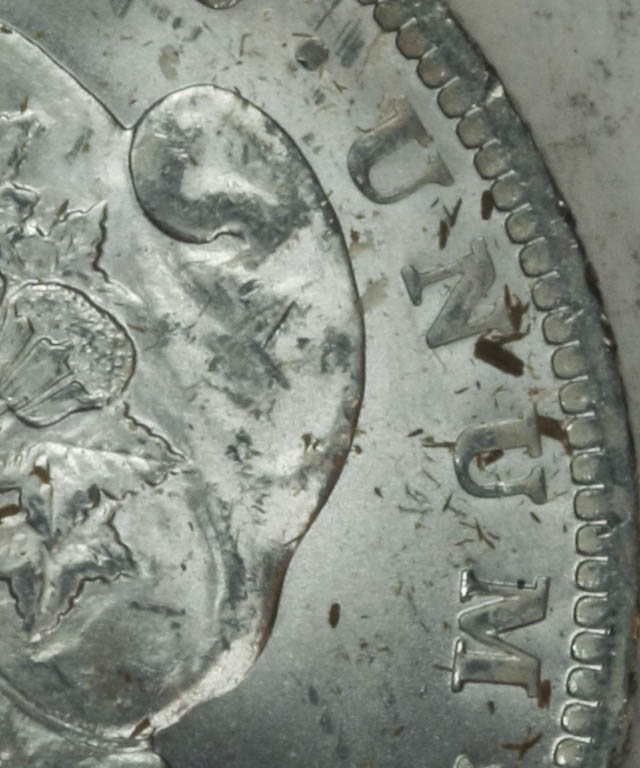 I found this coin today while processing a large lot of BU dollars. It appears to have been struck through some sawdust or wood fragments. It is had pieces on both the obverse and reverse. Note the O in ONE on the reverse. Most of the pieces are embedded in the coin but on the back of the cap you can see where a few pieces have come loose and left a depression in the surface of the coin. I thought this was neat and wanted to share.