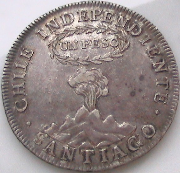 Depicted on the reverse one of the dozens of volcanos which line the Cordillera de los Andes (Andes Mountains) along its 4000 km journey from south to north in Chile.