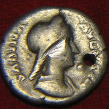 Sabina AR Denarius OBV: SABINA AVGVSTA, diademed & draped bust right, hair in queue down back REV: CONCORDIA AVG, Concordia standing left with patera and cornucopiae Struck at Rome, 128 AD 3g, 17mm RIC 390 Hadrian AR Denarius OBV: HADRIANVS AVG COS III P P, Laureate head right REV: AFRICA, Africa reclining left holding scorpion & cornucopiae, basket of grain at feet Struck at Rome, 136 AD 2.76g. 18.5mm RIC 299