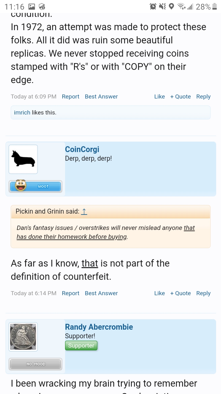 And you are mischaracterizing my series of comments as an attempt to prove his crap is counterfeit...I was intending to bring forward the information that would help me determine if it was so. It's not libelous to call something crap. It is libelous to call something counterfeit.