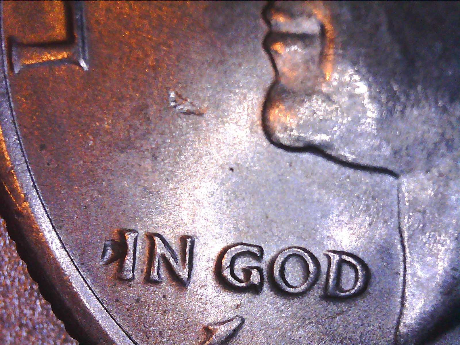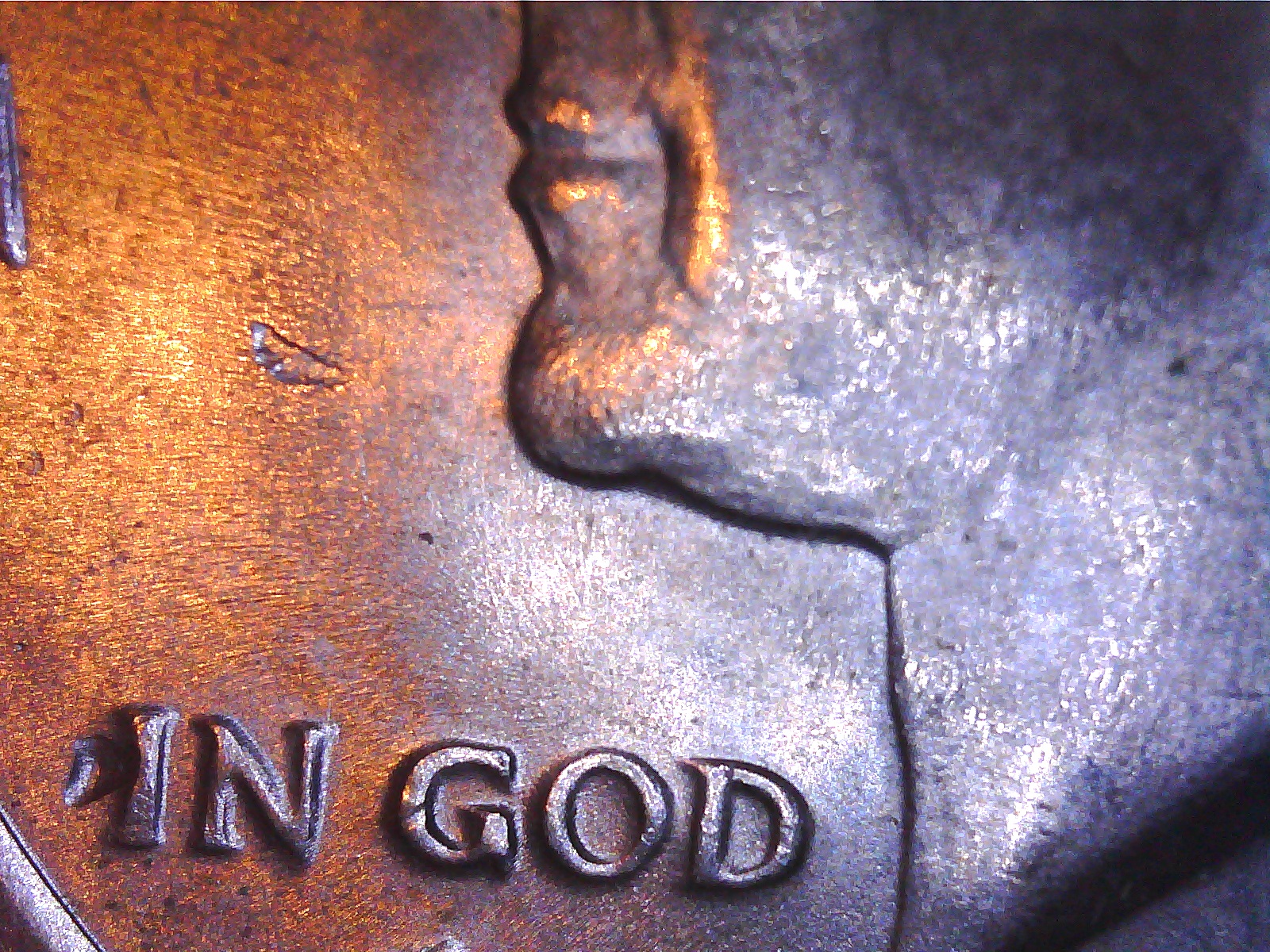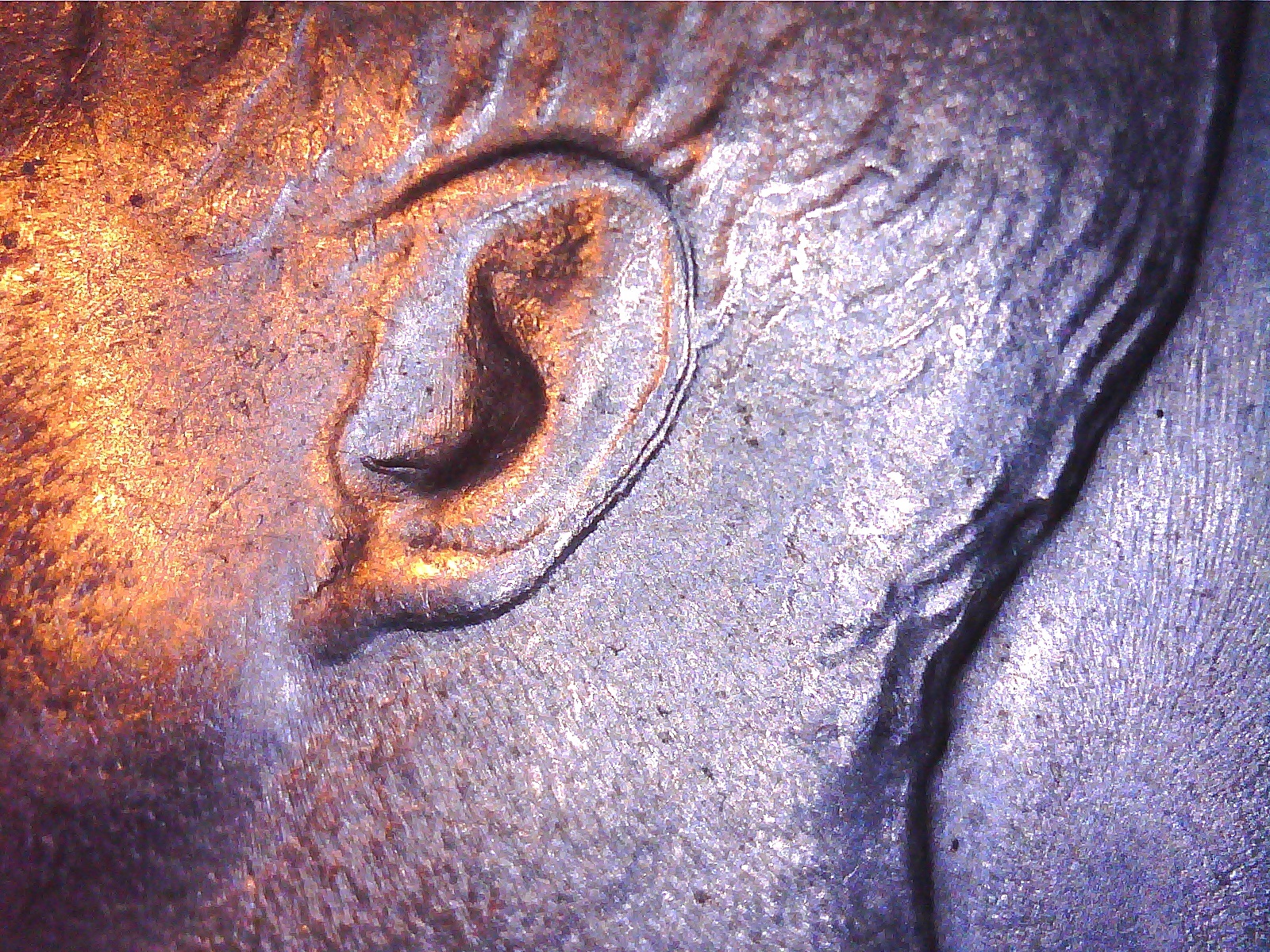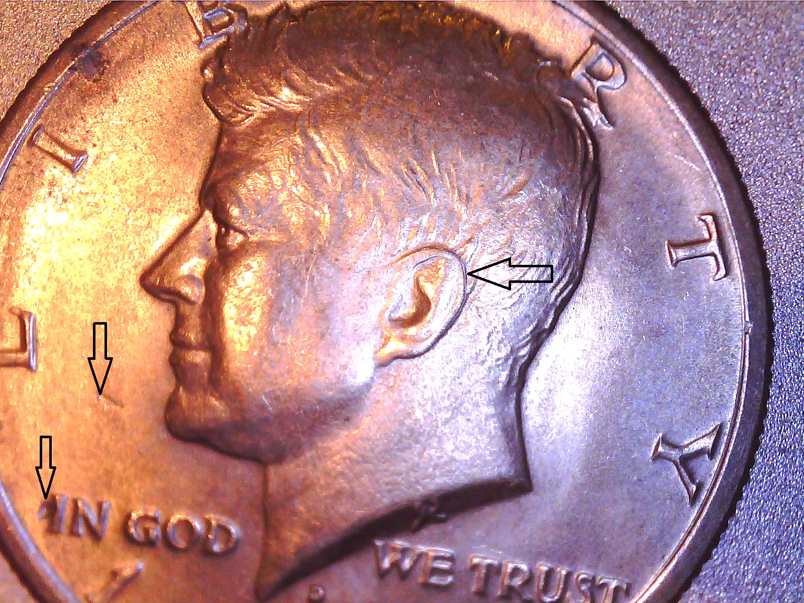 A closer look at the other area in the field between "L" and his chin doesn't look like PMD to me either. The luster inside the indent matches the surface of the coin, there is not much sign of circulation damage on the coin anywhere other than a few tiny nicks and scratches, and the reverse shows no sign of opposing a blow to the obverse.