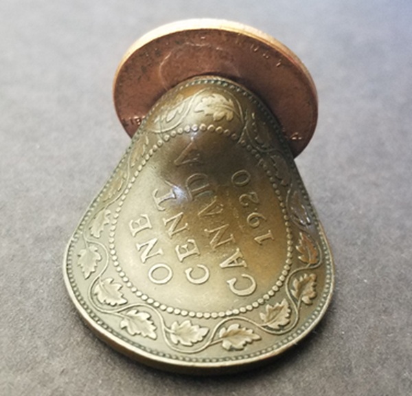 Lots of holed coins already, so how about this watch fob, further mutilated by going through the pulper at a recycled newspaper plant.