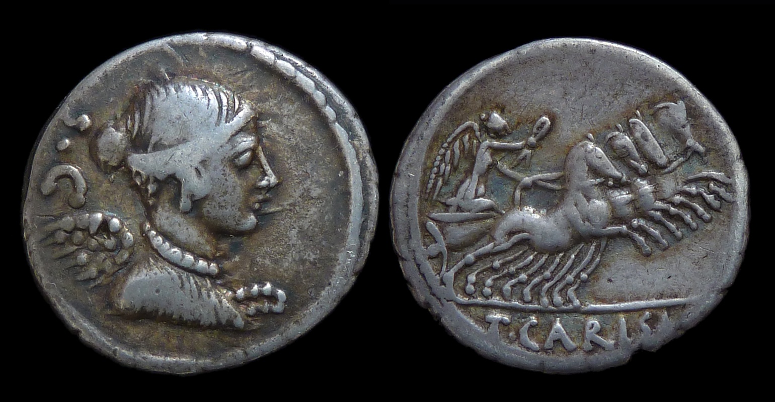 That's a very enviable collection, with many types still on my want list. I'm looking forward to seeing the 2 coins that will fill out the last two slots on that tray. My own RR collection is small enough that I managed without great inconvenience to get them all out of their envelopes for a quick group pic sometime last year. Obverses... Reverses... This year so far, I've added only a single RR to my collection. ROMAN REPUBLIC AR Denarius. 3.75g, 19mm. Rome mint, 46 BC. T. Carisius, moneyer. Crawford 464/5; Sydenham 985. O: Draped bust of Victory to right; behind, S•C. R: T•CARISI, Victory in prancing quadriga to right, holding wreath in her right hand and reins in her left.